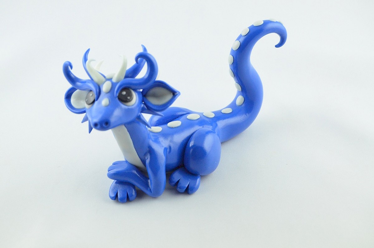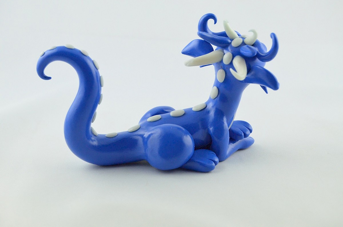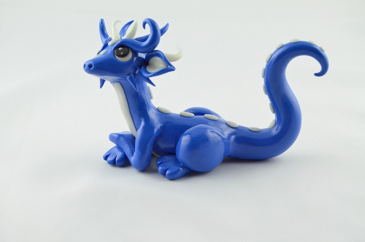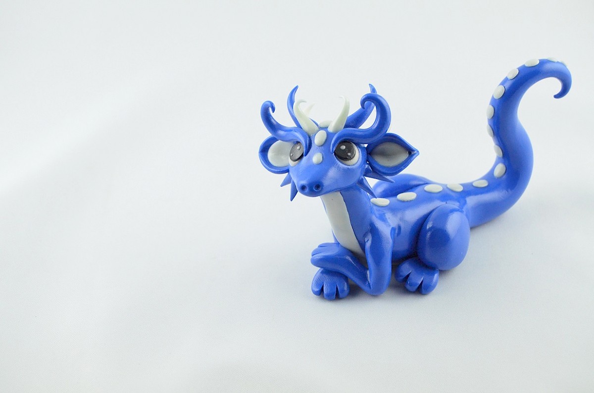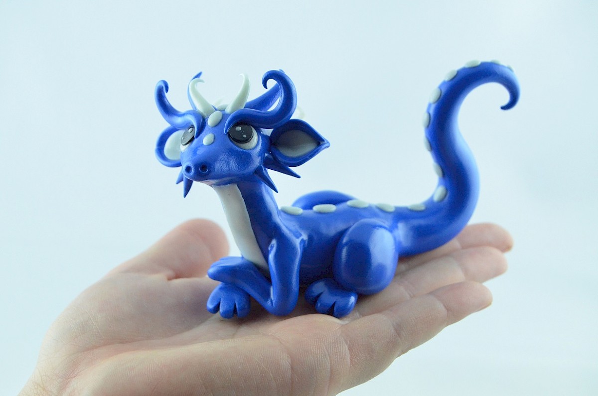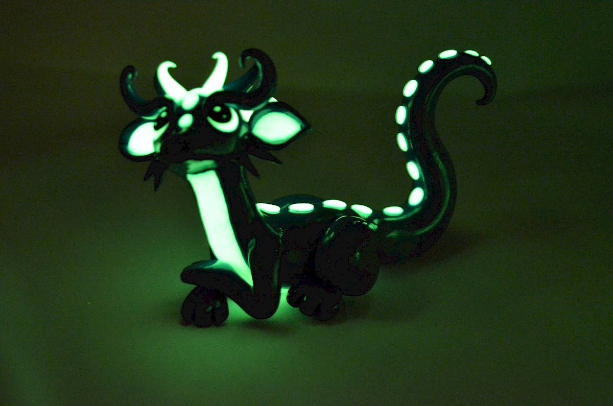 The blue dragon is a friendly and curious about the world creature. He loves meeting with his dragon friends and talking about everything. White parts of the dragon body are made of clay shining in the darkness, the view is special.