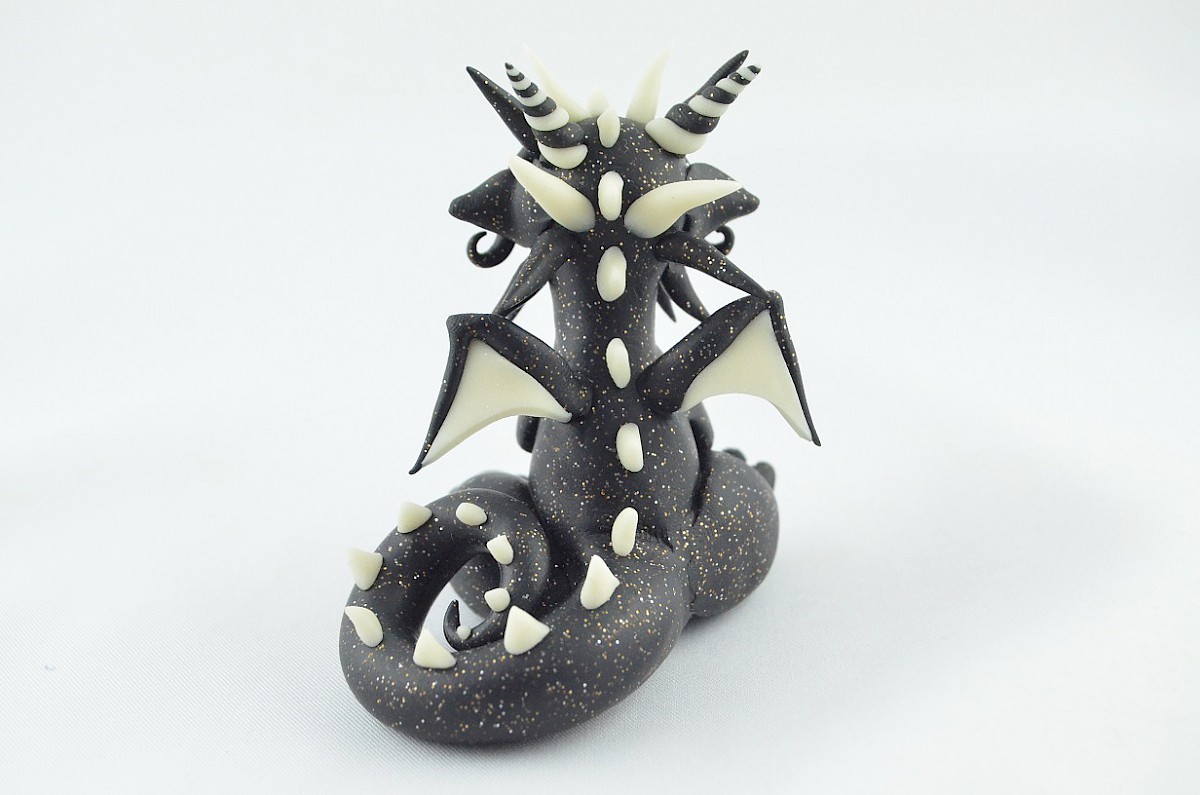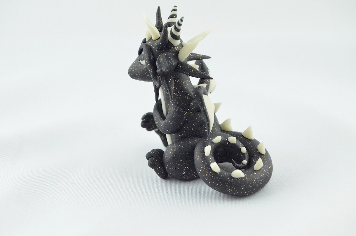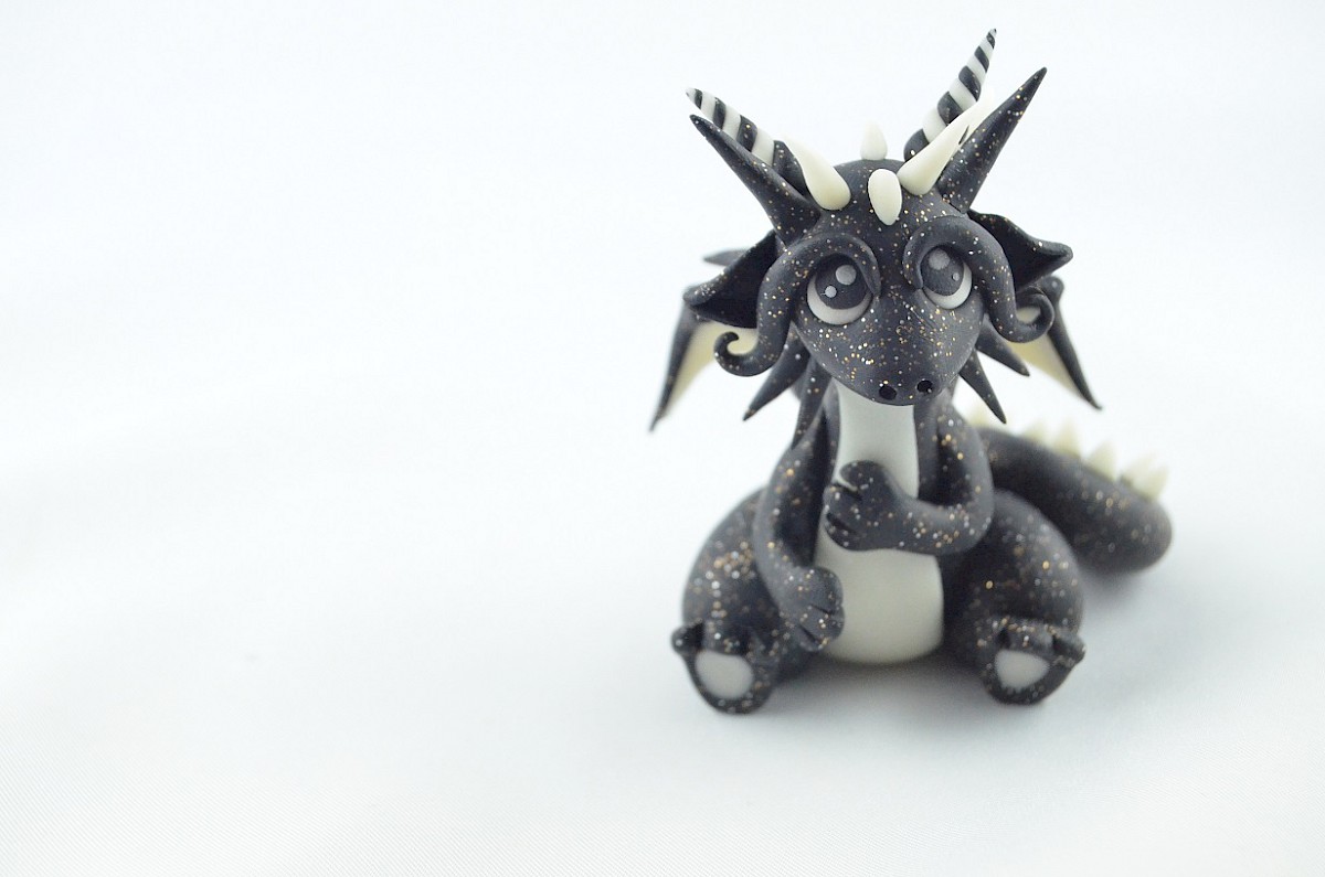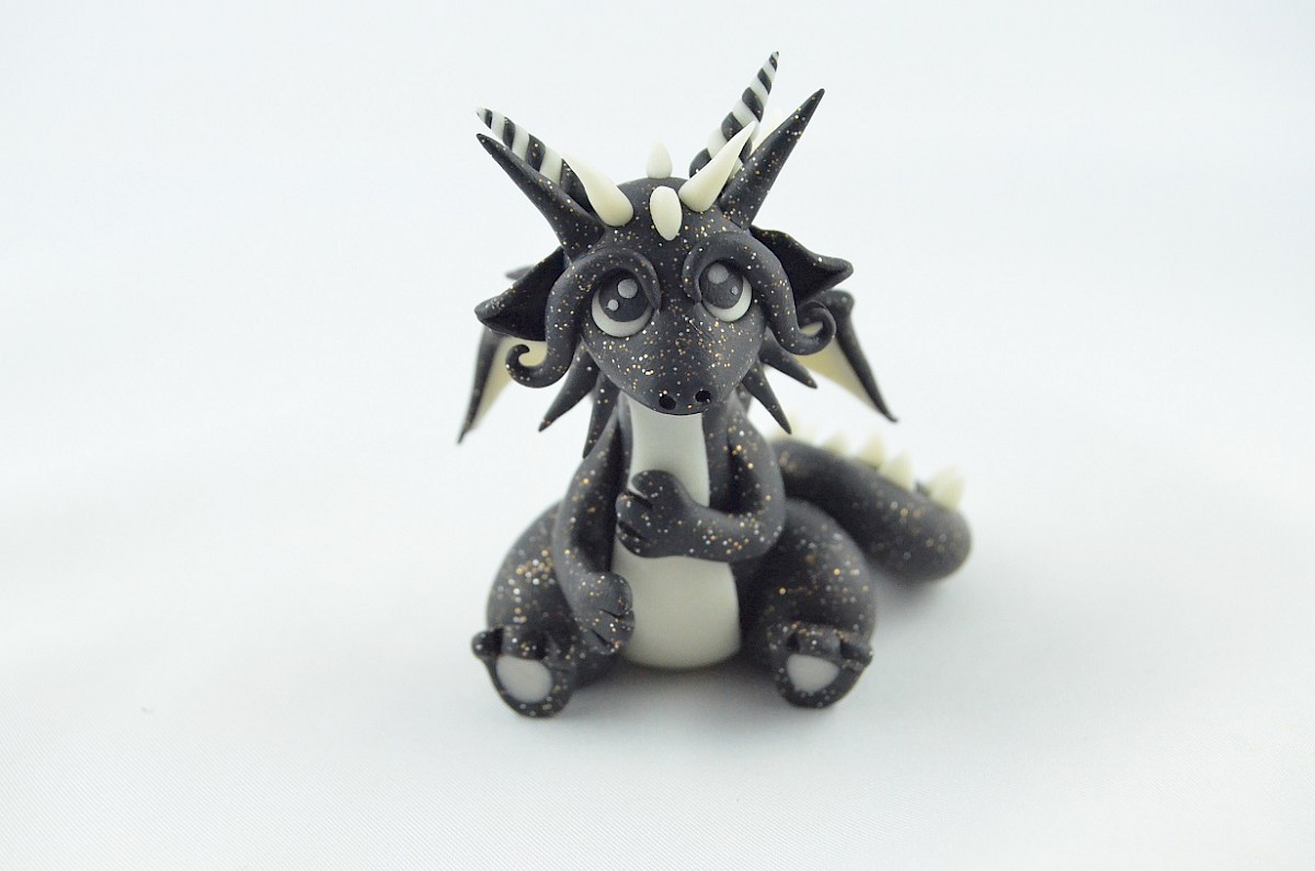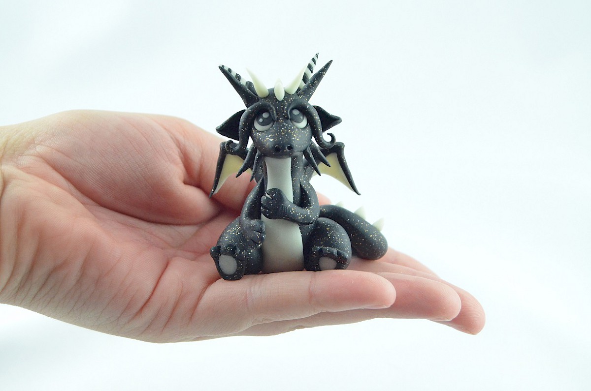 This is a handmade sculpture of little dragon. He is a calm, friendly and loving hugging creature. His appearance is unique. The dragon’s black body glitters like a dark night full of stars and the white details shine in the darkness. The clay dragon likes making friends so much. The sculpture may be a perfect gift or another special dragon in your collection!