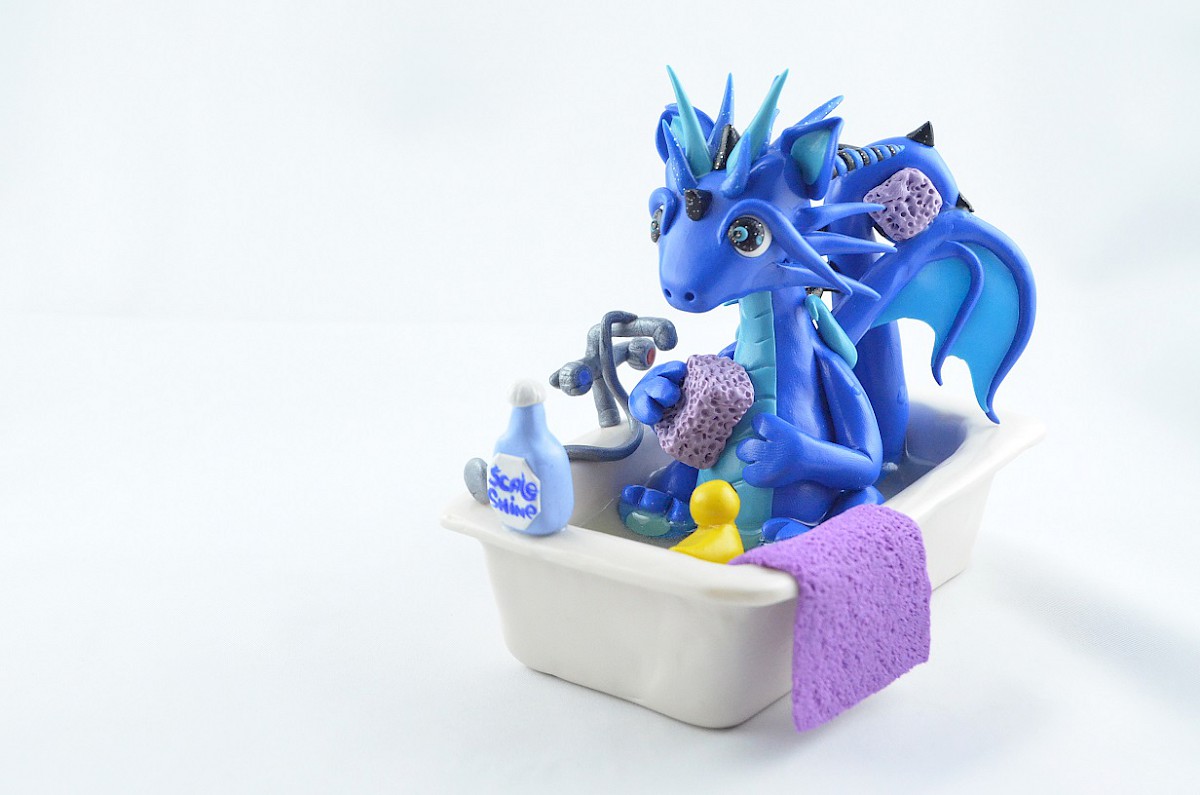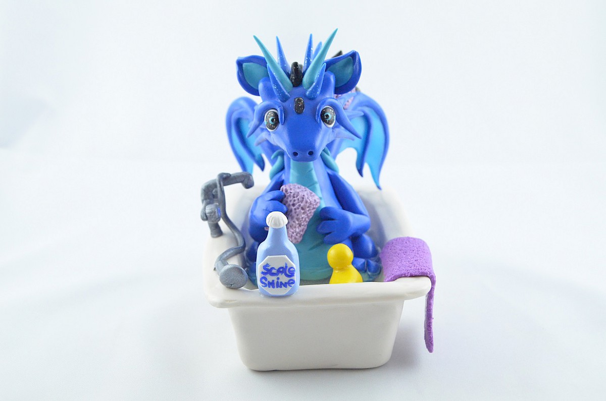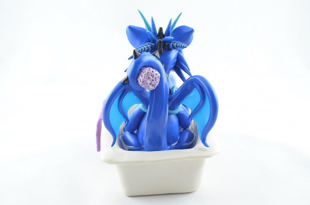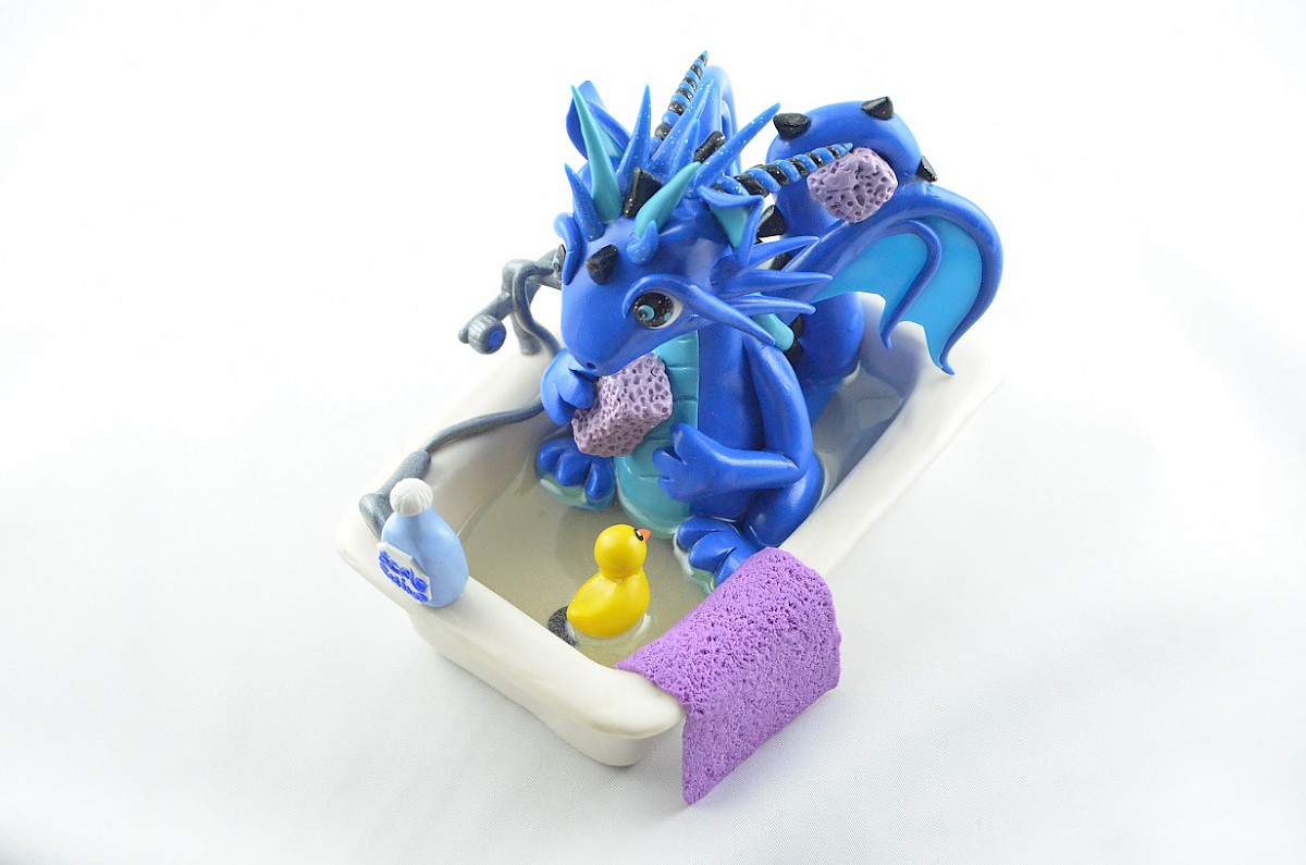 blue dragon in a bath is handmade by me using polymer clay and resin (water in the bathtub)