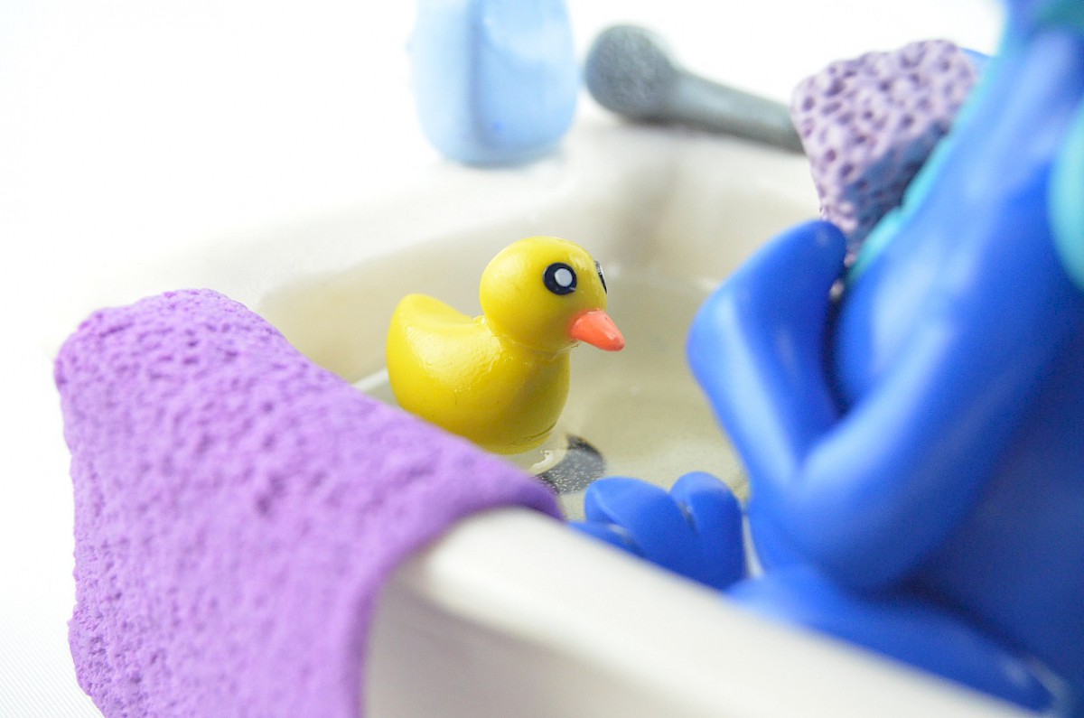 Blue Dragon is using his favorite shampoo called „scale shine”, because it makes loads of bubbles which the dragon loves. Little yellow duck is keeping him company. The blue dragon is talking with the duck while scrubbing his long tail!