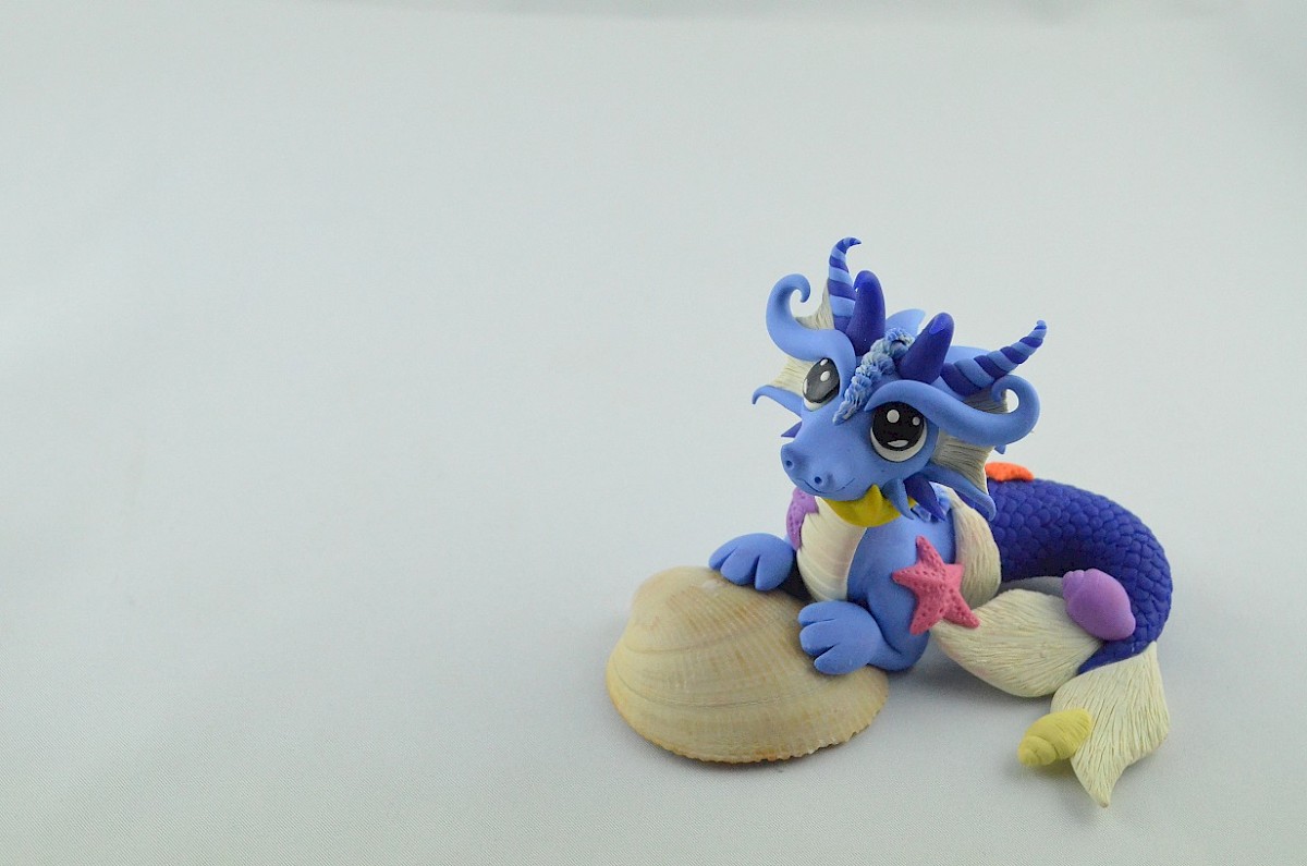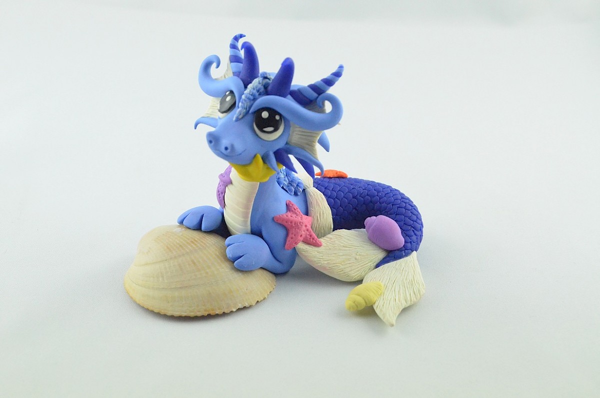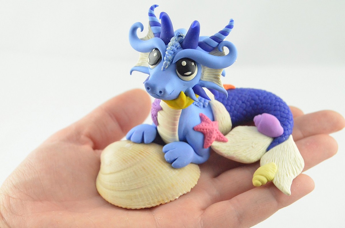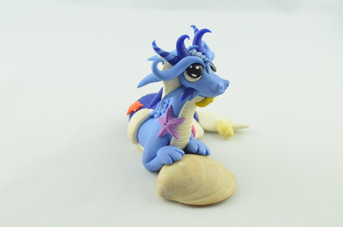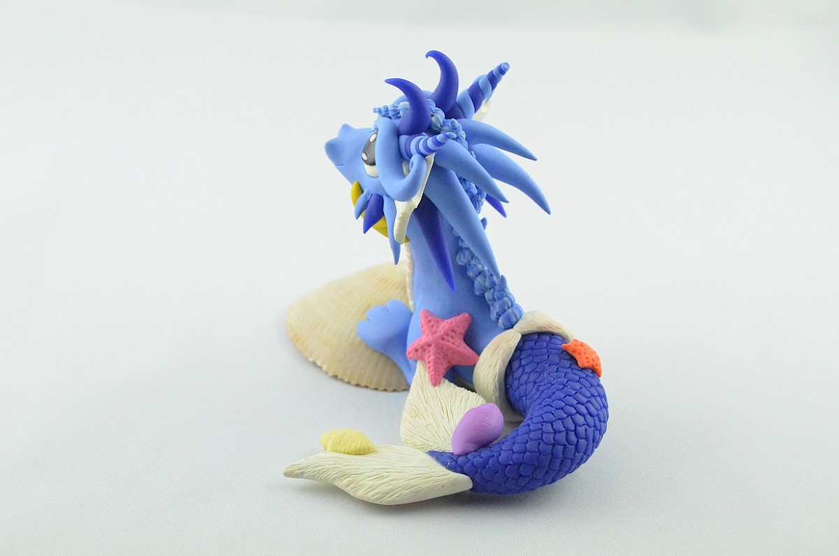 This creature isn't an ordinary dragon, it is a siren dragon! The scales of his fish tail are in the same color as the horns. Little starfish and water snails are hitched to the clay sculpture, but the dragon doesn't mind it. He loves the company of his small friends.