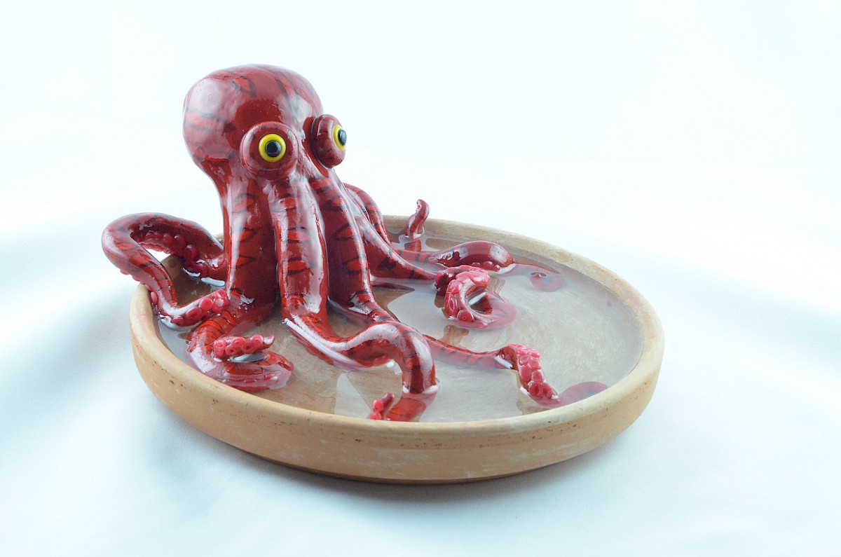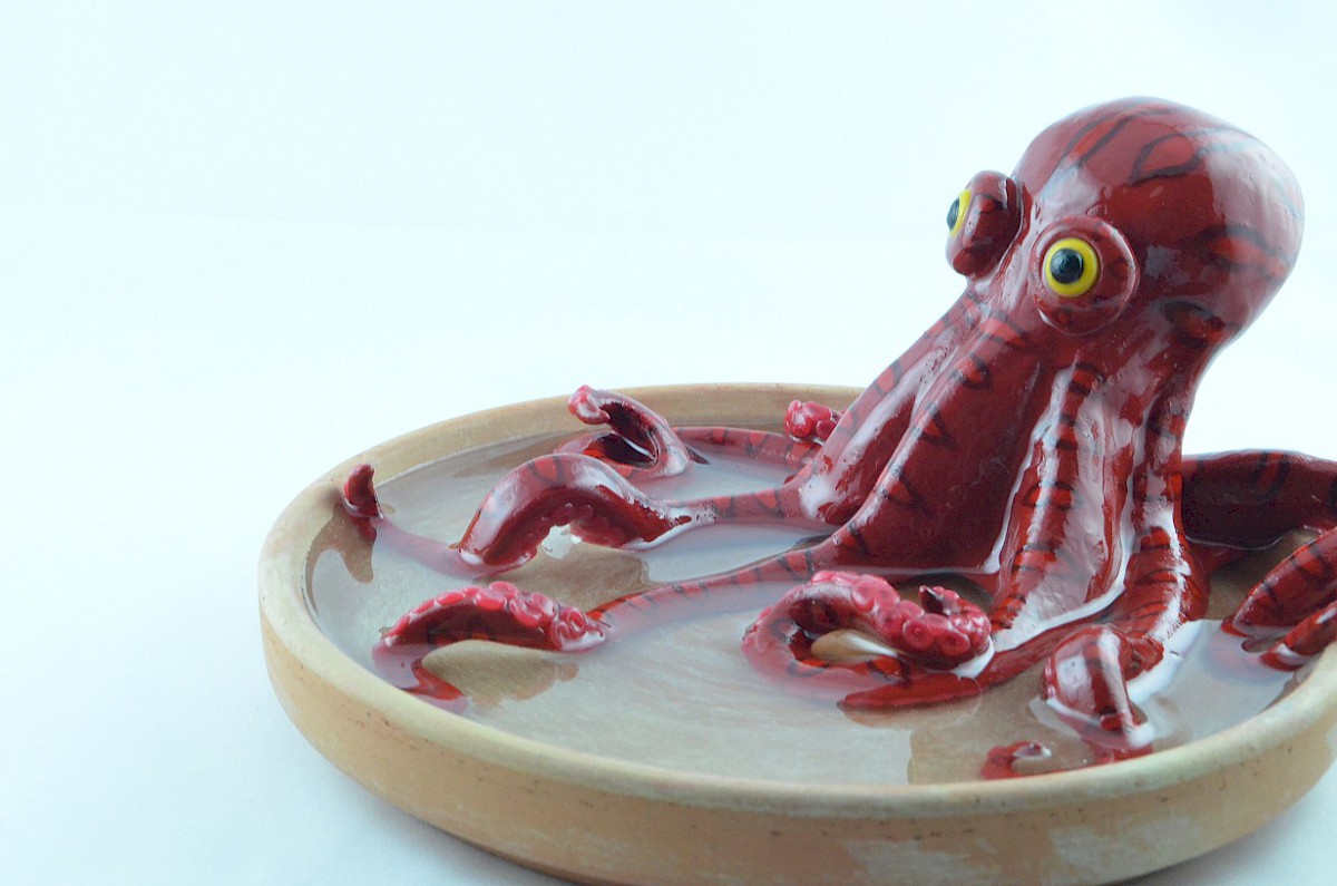 fist i have to sculpt octopus then bake her. After clay octopus is baked and cold i use acrylic paints to paint details on skin, then after paint is dry i use paints again to paint some more details. After painting is complete and paint is dry i mix resin to create water effect. During that time i glaze octopus with resin - for wet look and protection.