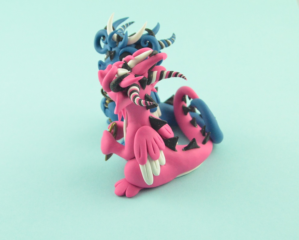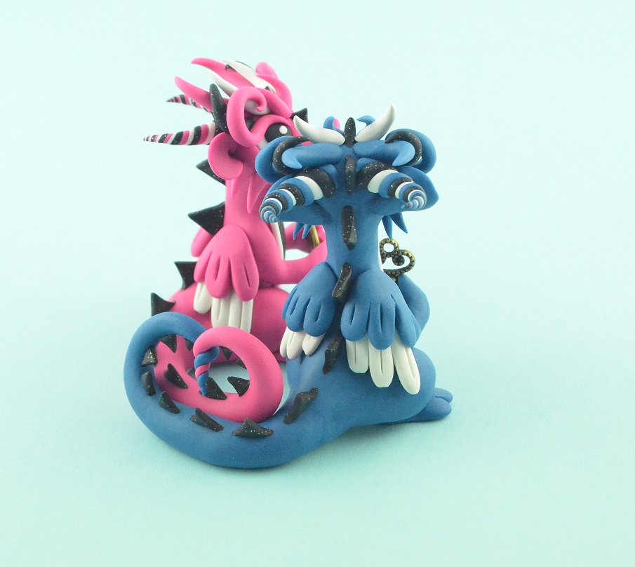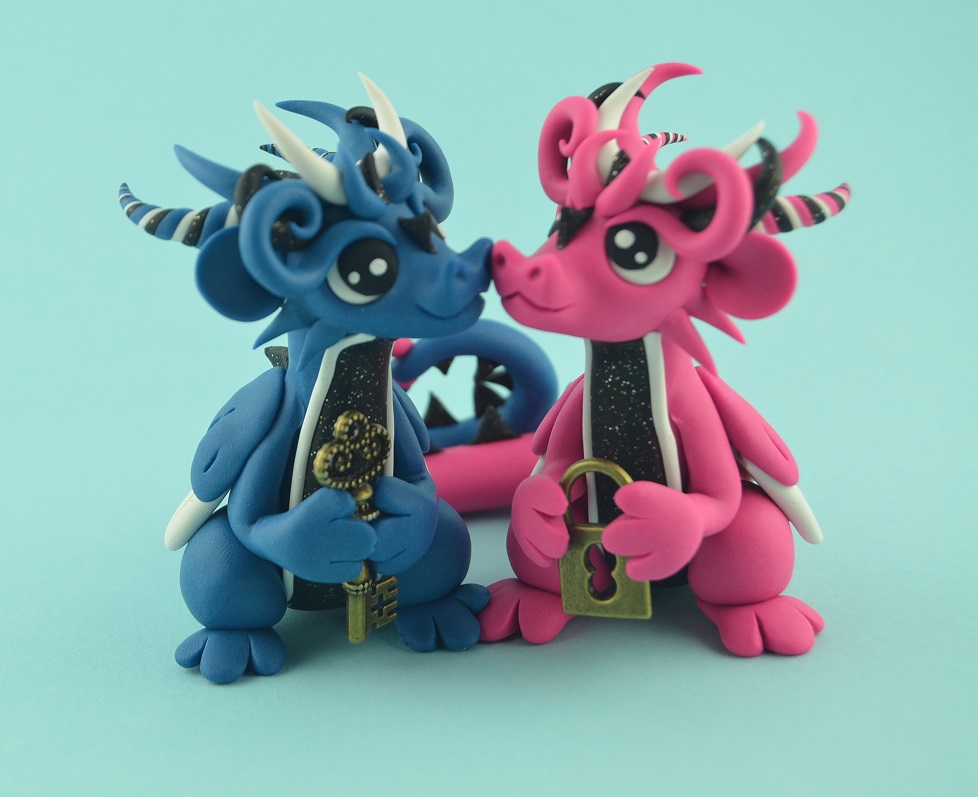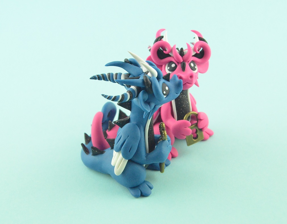 The blue dragon has the key to the padlock held by his girlfriend. The loving dragon couple spends together every little moment. The glitter parts of the figurines shine in the sunshine! dragon sculpe can be use as wedding cake topper or engagement gift.