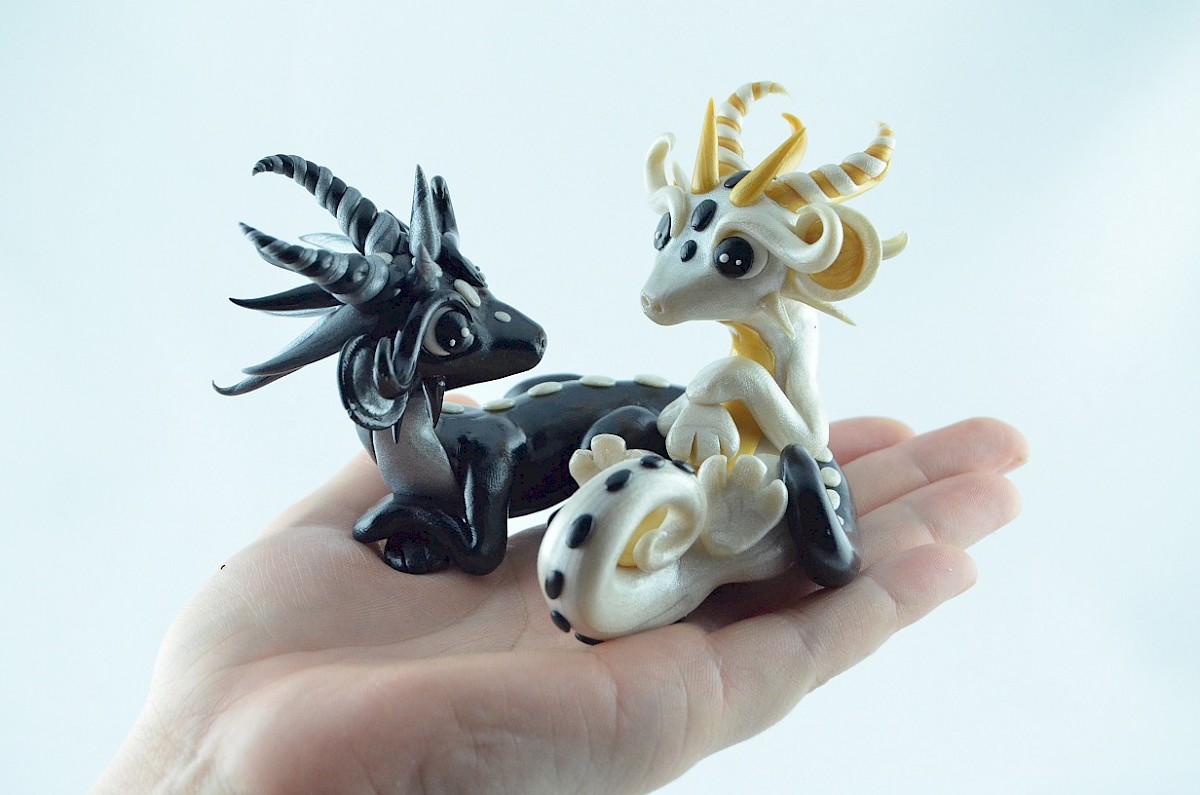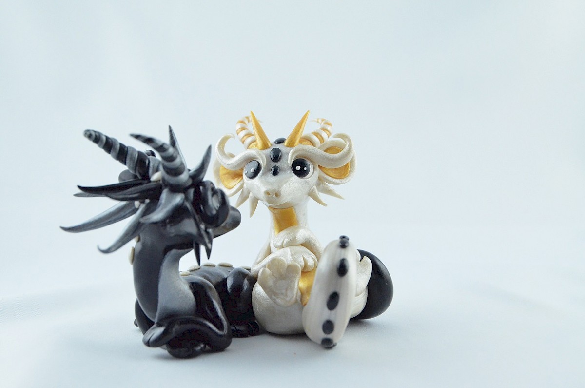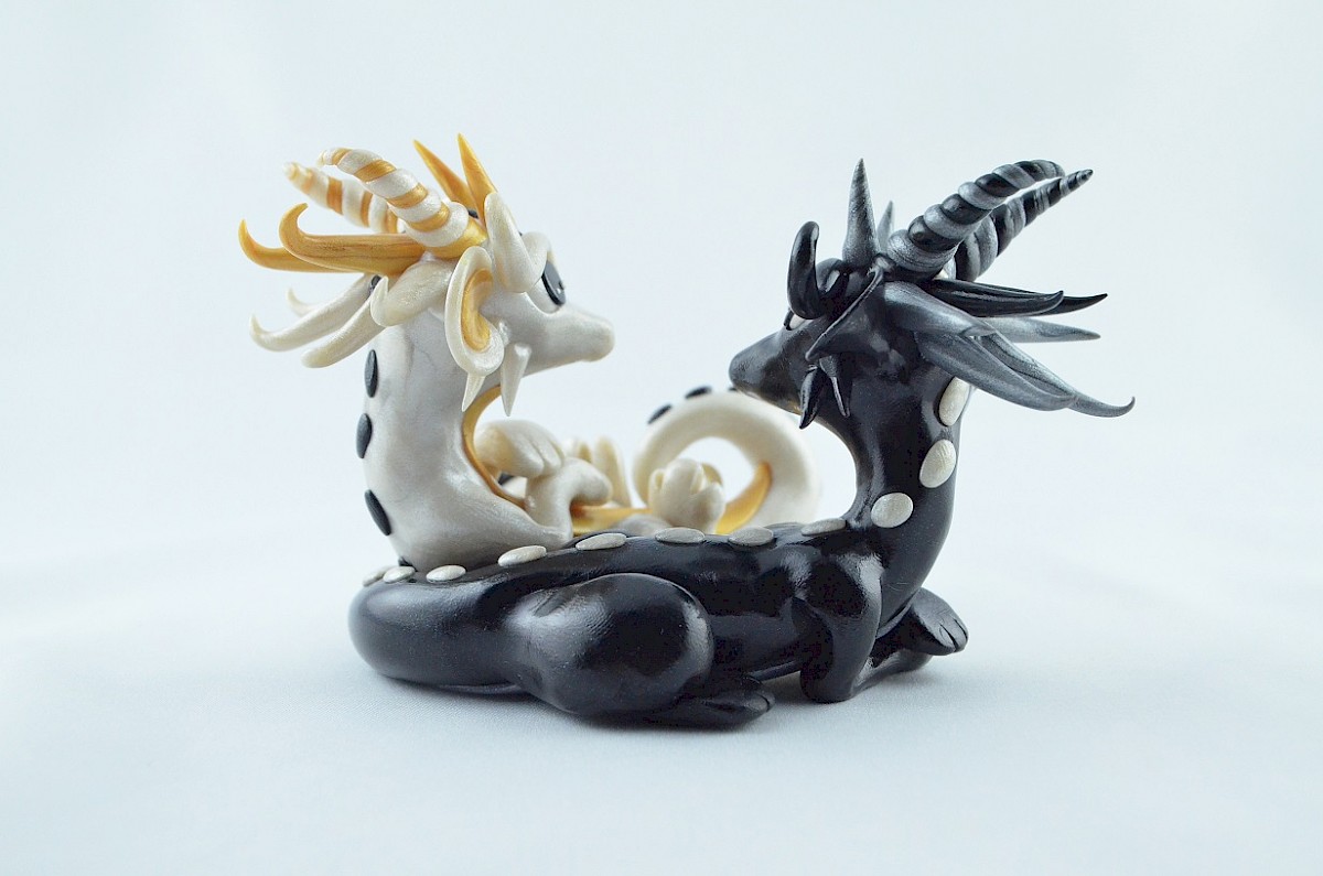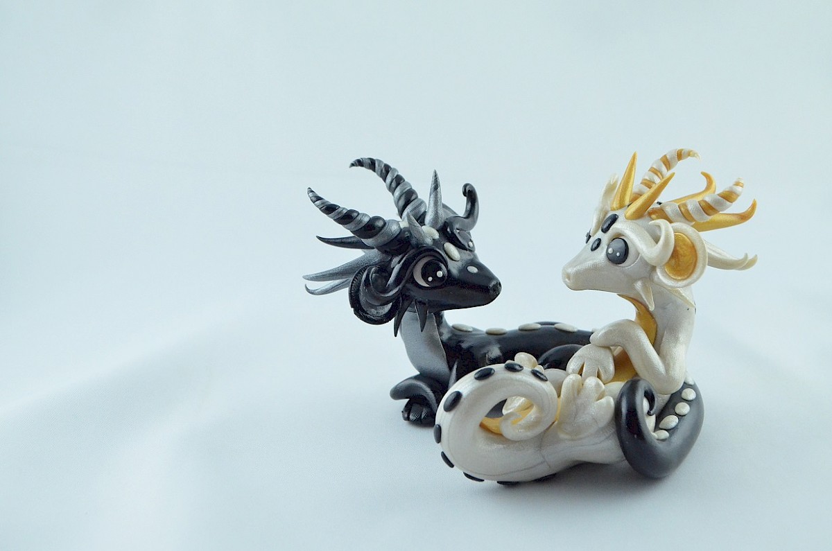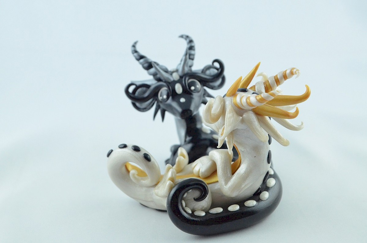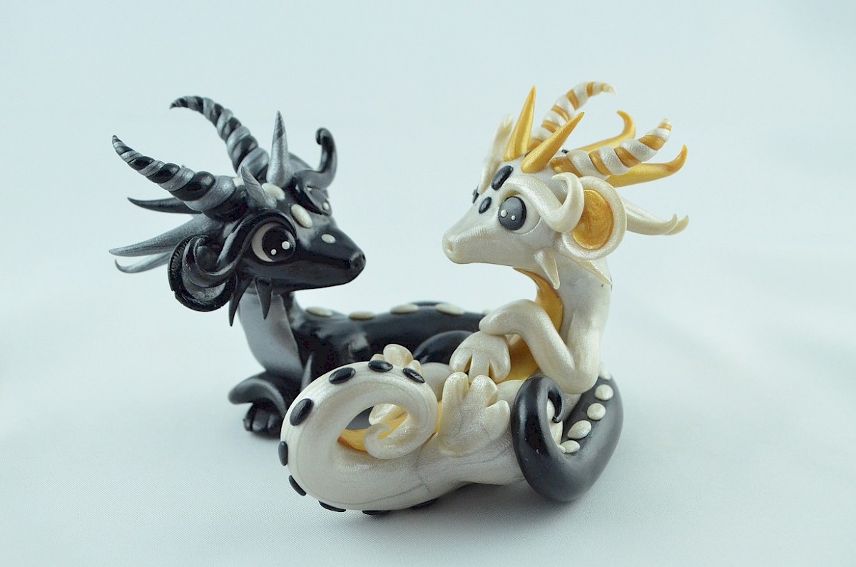 Can you feel the love in the air? The dragon handmade couple is inseparable. They adore each other. The black clay dragon is looking at his beloved sitting next to him. The white dragon girl feels safe and happy. The colors go together – black suits white and silver matches golden.