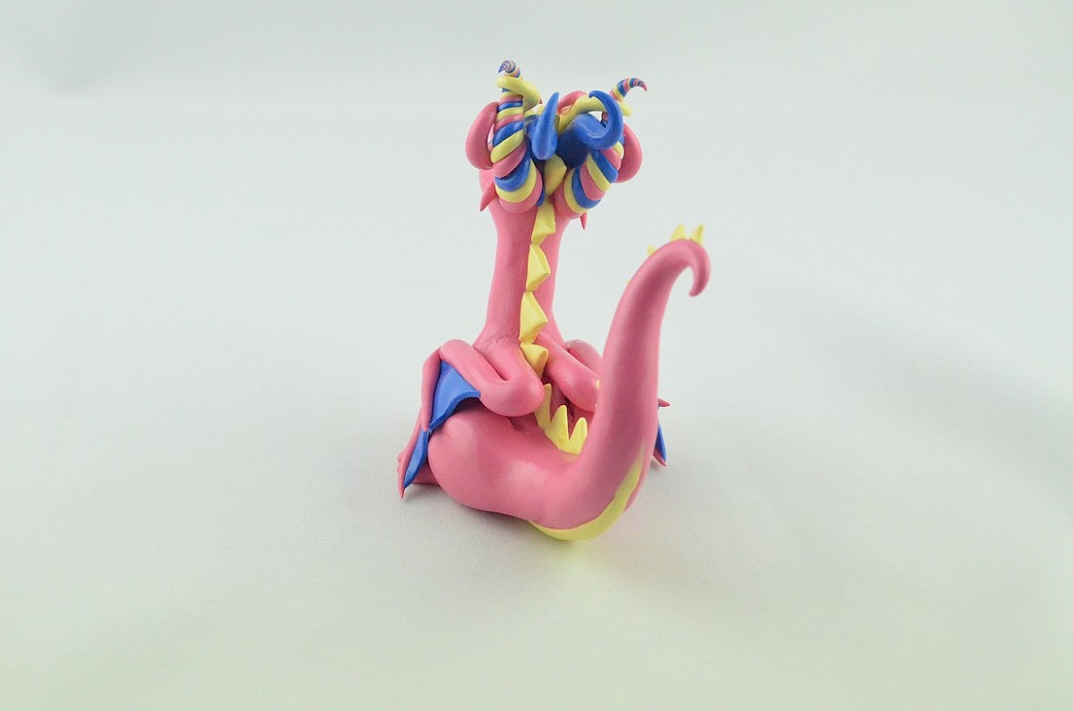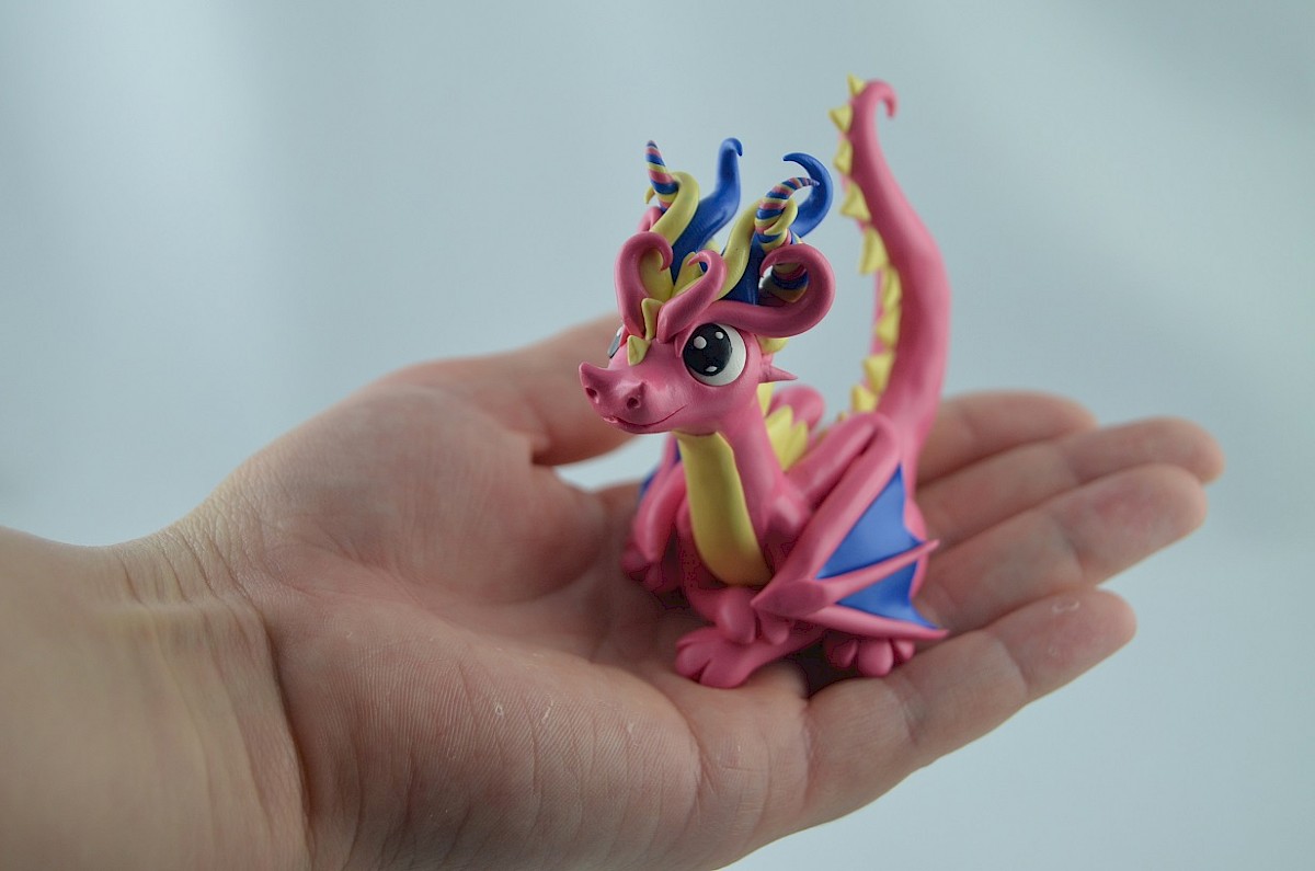 Adorable sculpture of dragon princess is unique. Colorful horns looking like a crown, long tail up and huge smile make the dragon girl win your heart! The figurine is fully handmade, you can use it as a gift or decoration. The dragon princess can't wait to find new friends.
