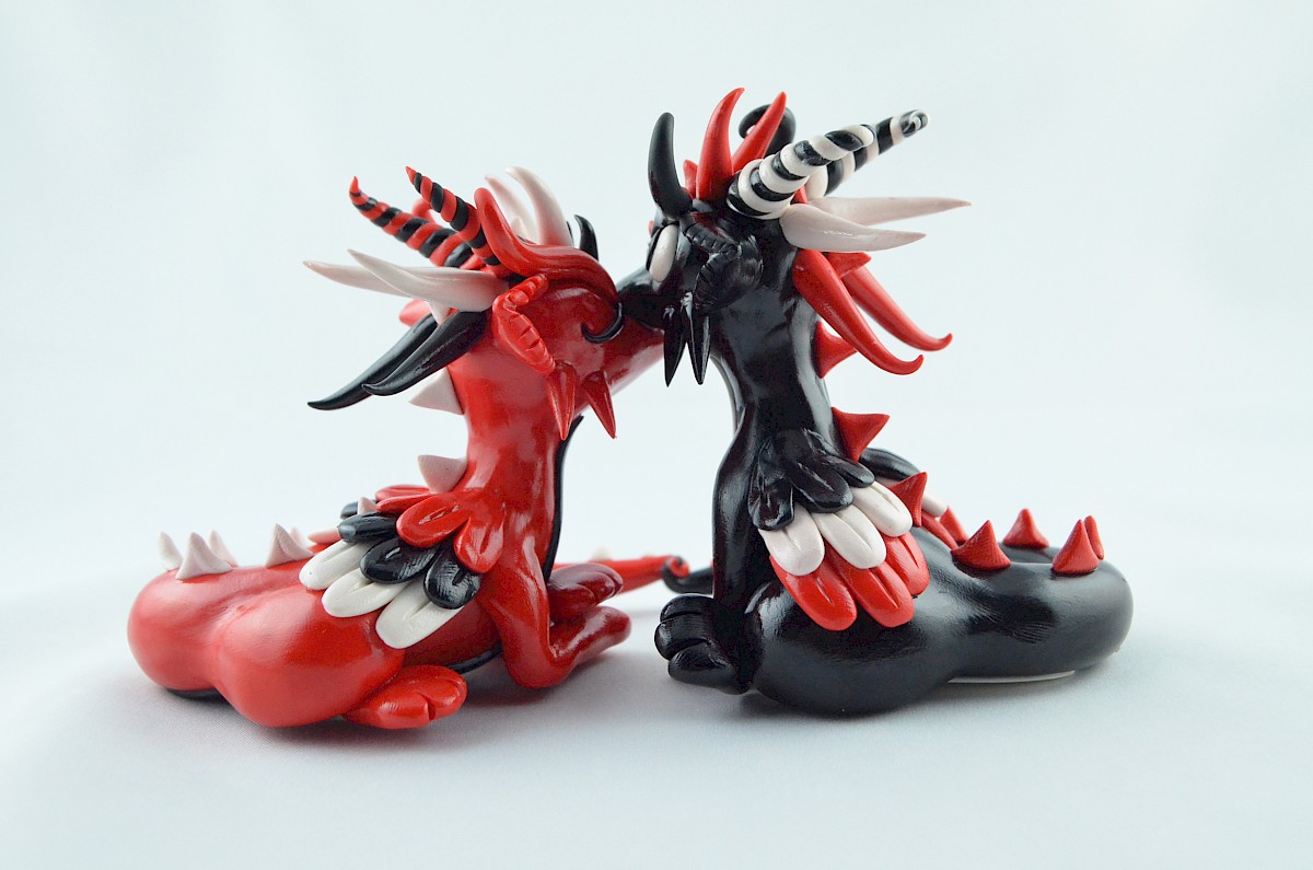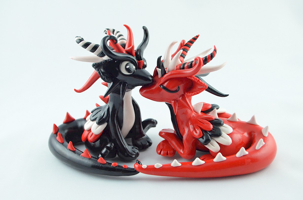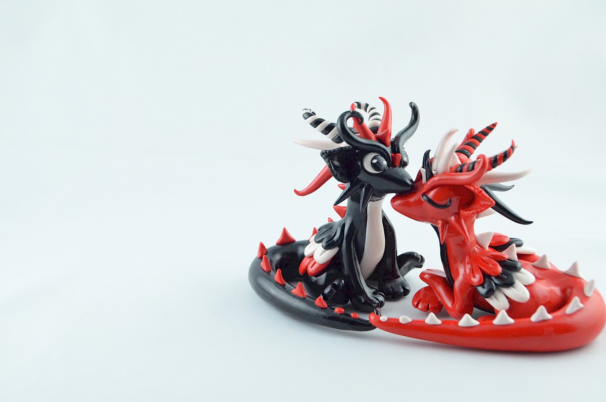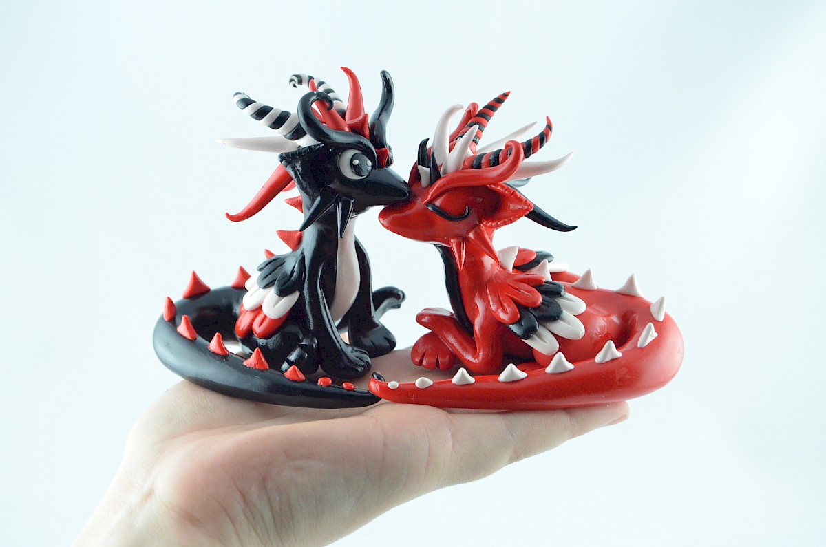 The two of the dragon lovers feel connected in their relationship. The red handmade dragon is very emotional and romantic. The black dragon would do everything for her! The dragon sculpture's colors go together, the dragon wings and horns are precisely handmade.