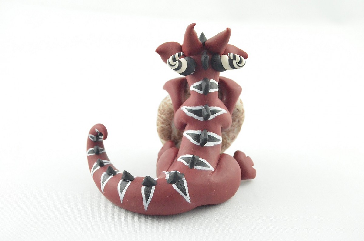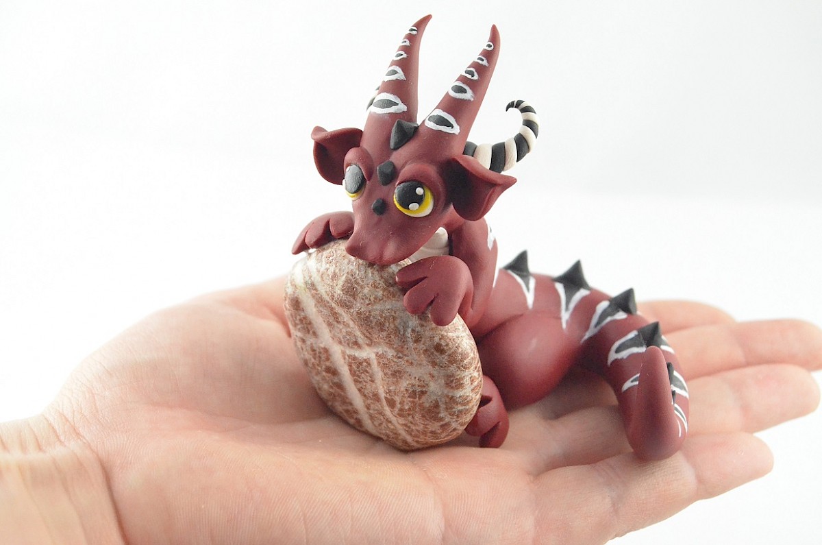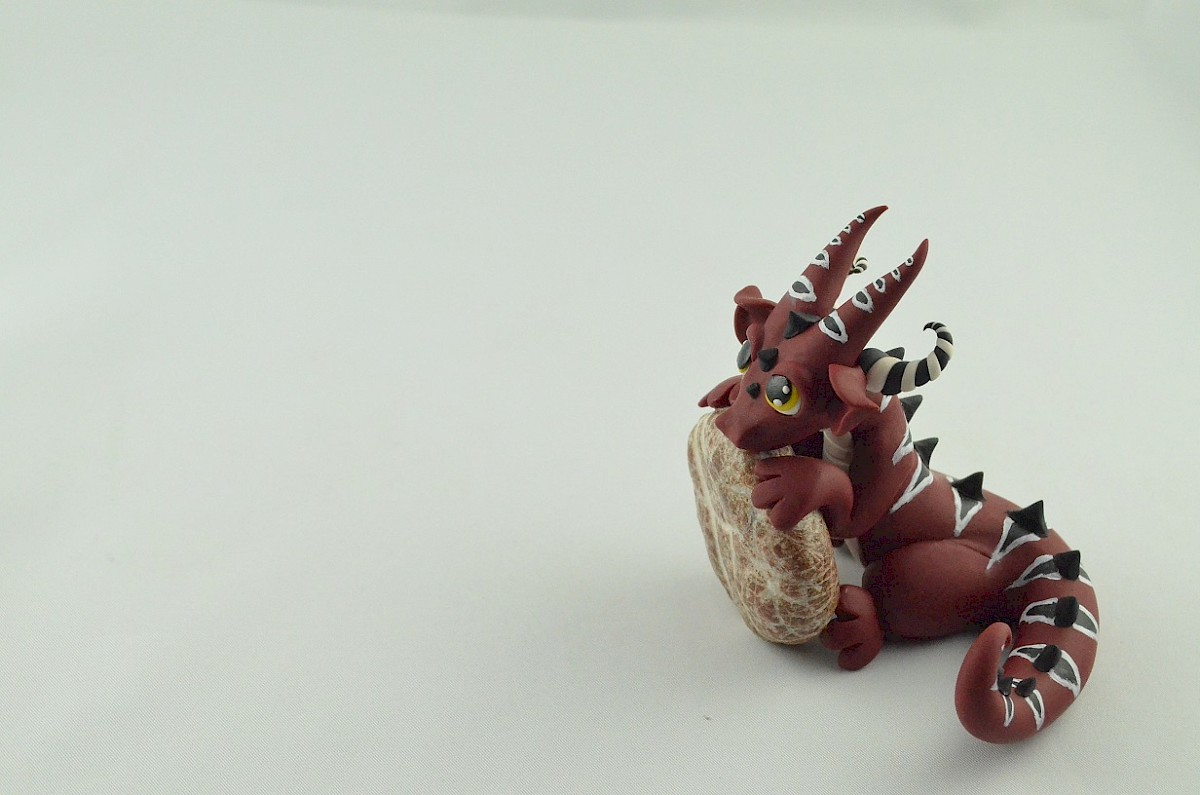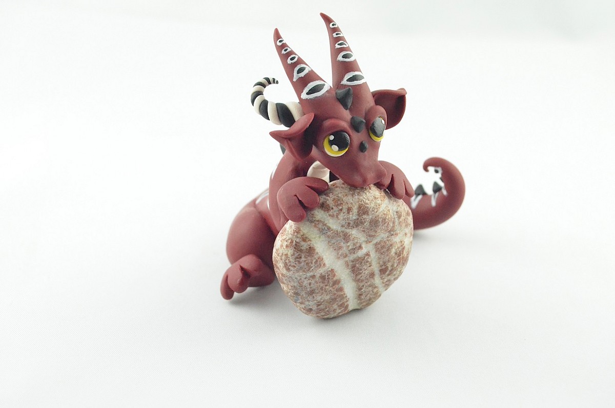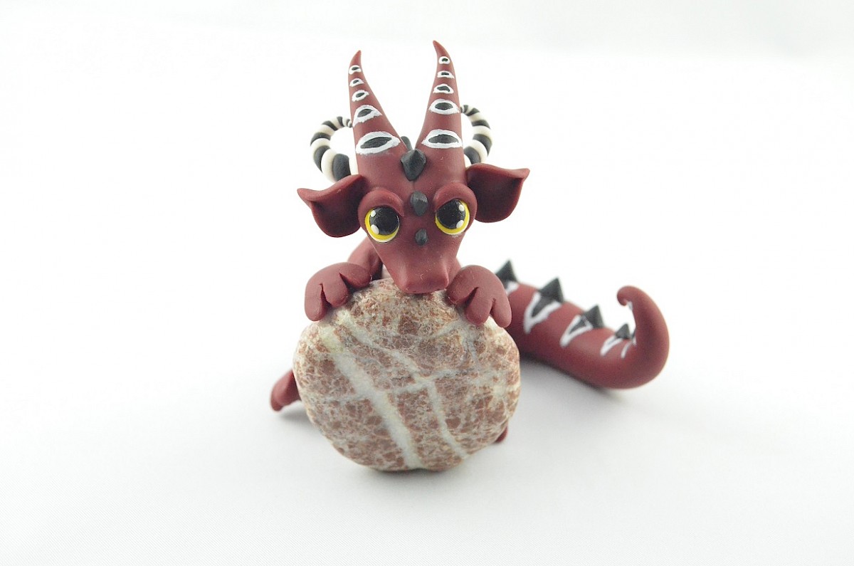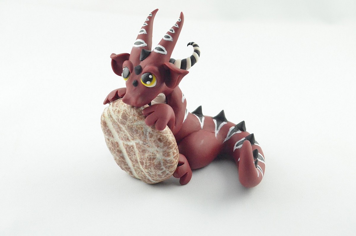 Colorful patterns and black scales cover the dragon body. His yellow mesmerizing eyes catch attention. The whole sculpture is handmade of polymer clay. The dragon figurine is holding a real stone which is full of dragon stories and memories ;)