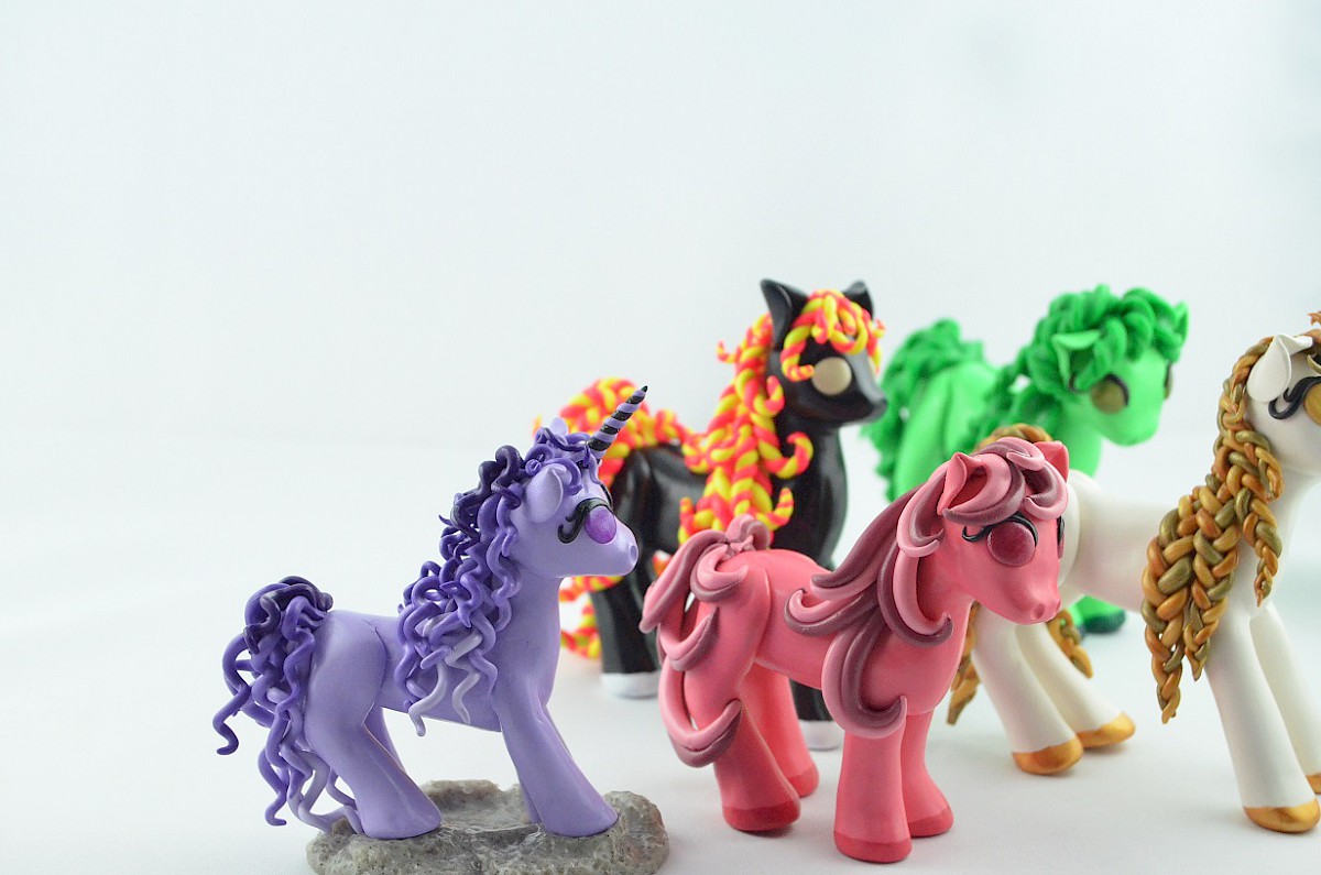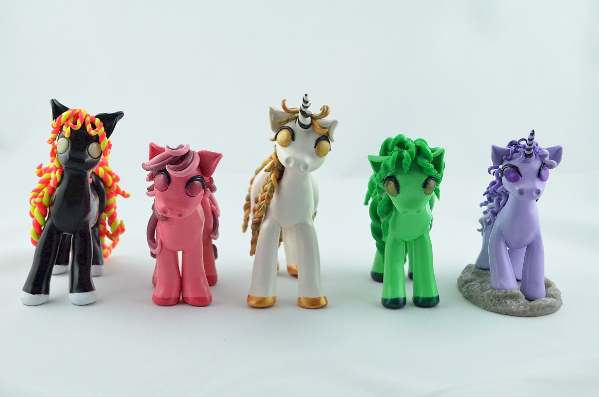 Every little pony sculpture is a part of the rainbow. That's why they are so colourful, cheerful and pretty! The handmade ponies have their own unique style and hobby, but all of them enjoy running through the meadows.