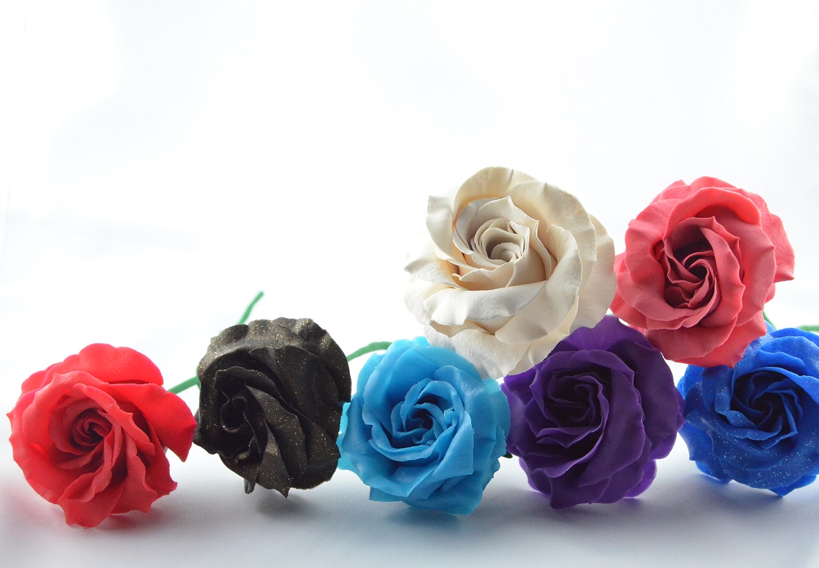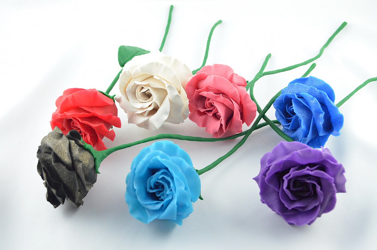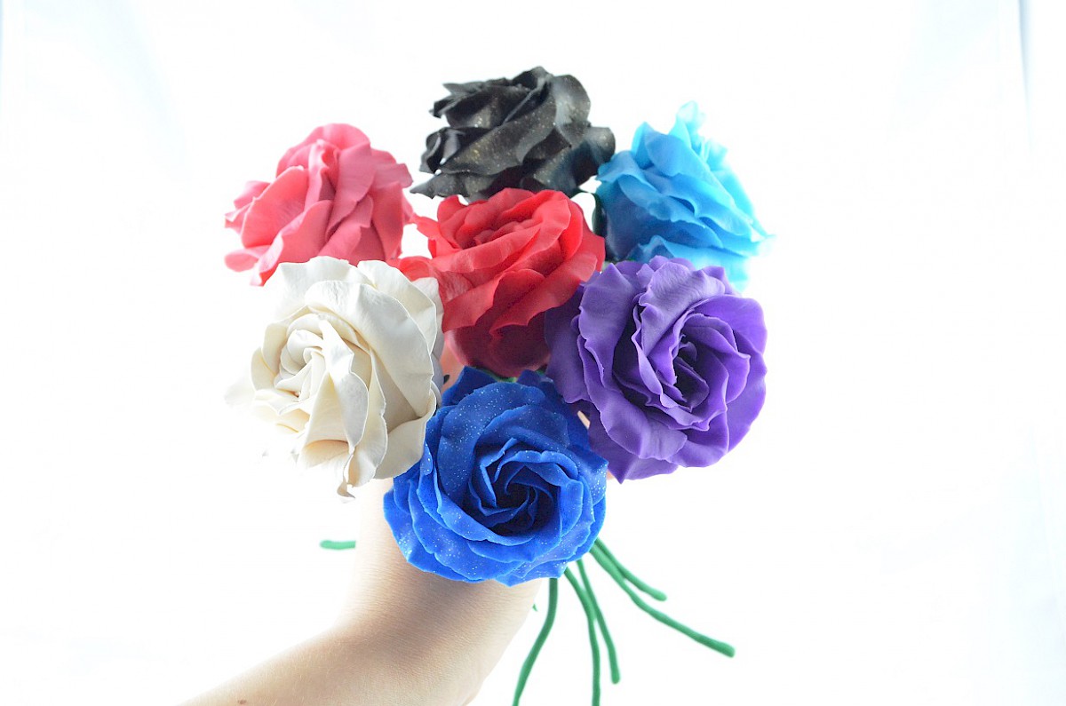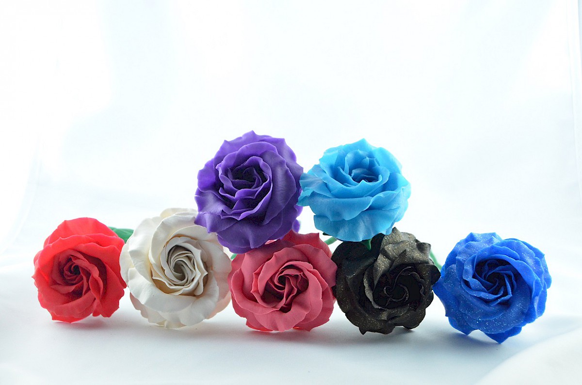 Each of them is unique and made with the utmost precision. Rose petals seem to be alive – their shape and appearance is very natural. (In addition the petals of two roses, the black and dark blue ones, shine thanks to glitter).