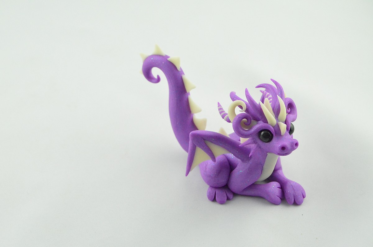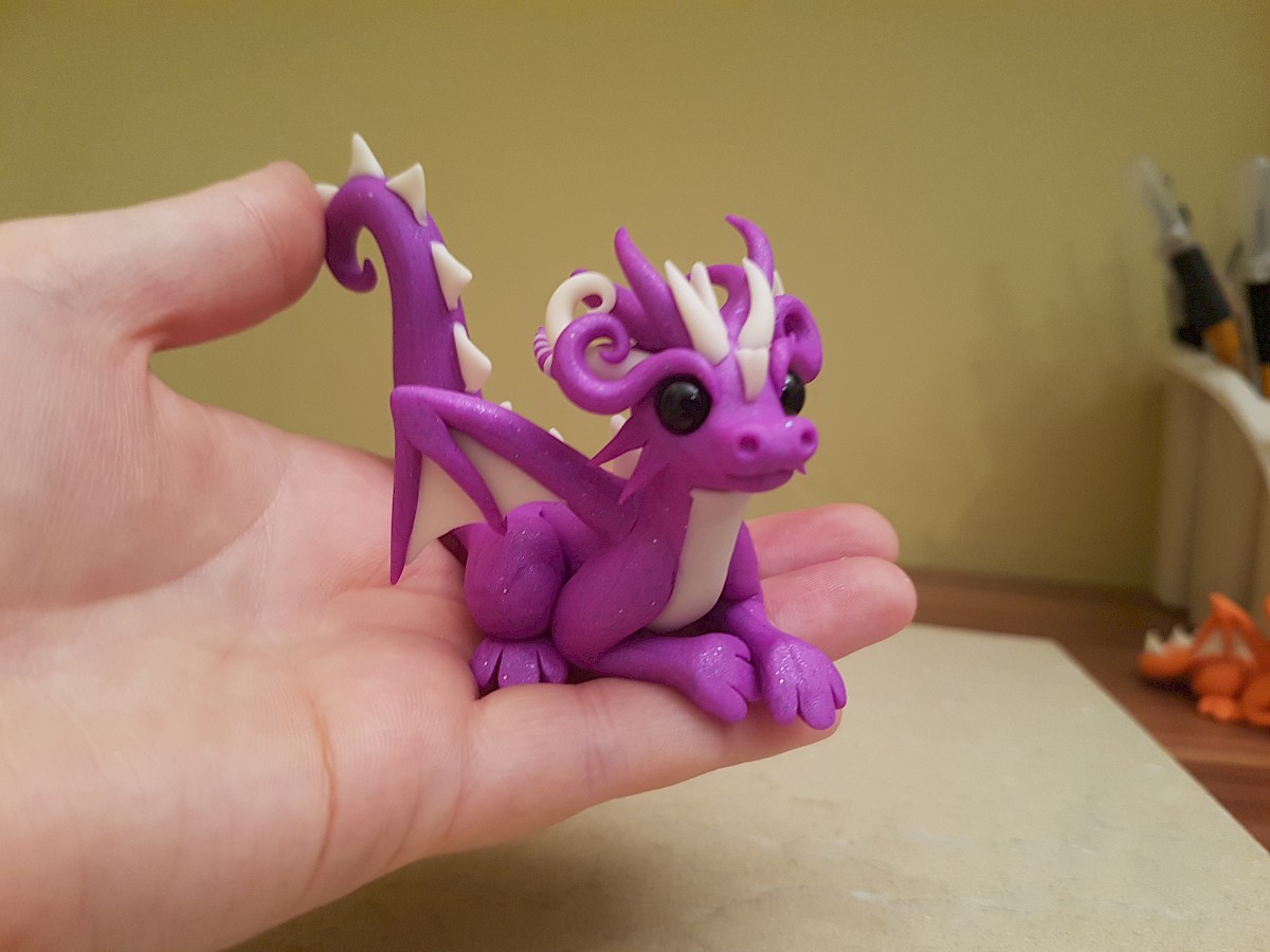 The dragon's skin is covered by glitter what makes it look like a jewel. What is more, the white parts of the handcrafted figurine are made of clay shining in the darkness! The little cute dragon is a special sculpture which may be used as an unusual decoration or a perfect gift for your loved one.