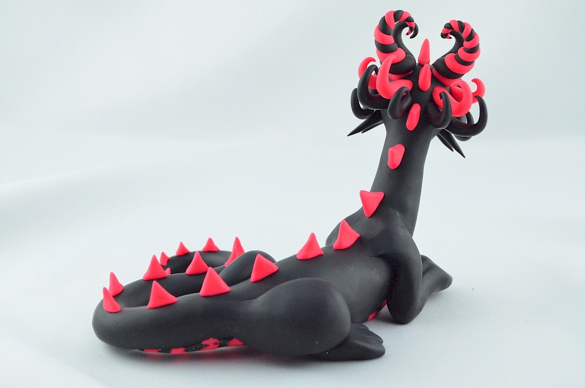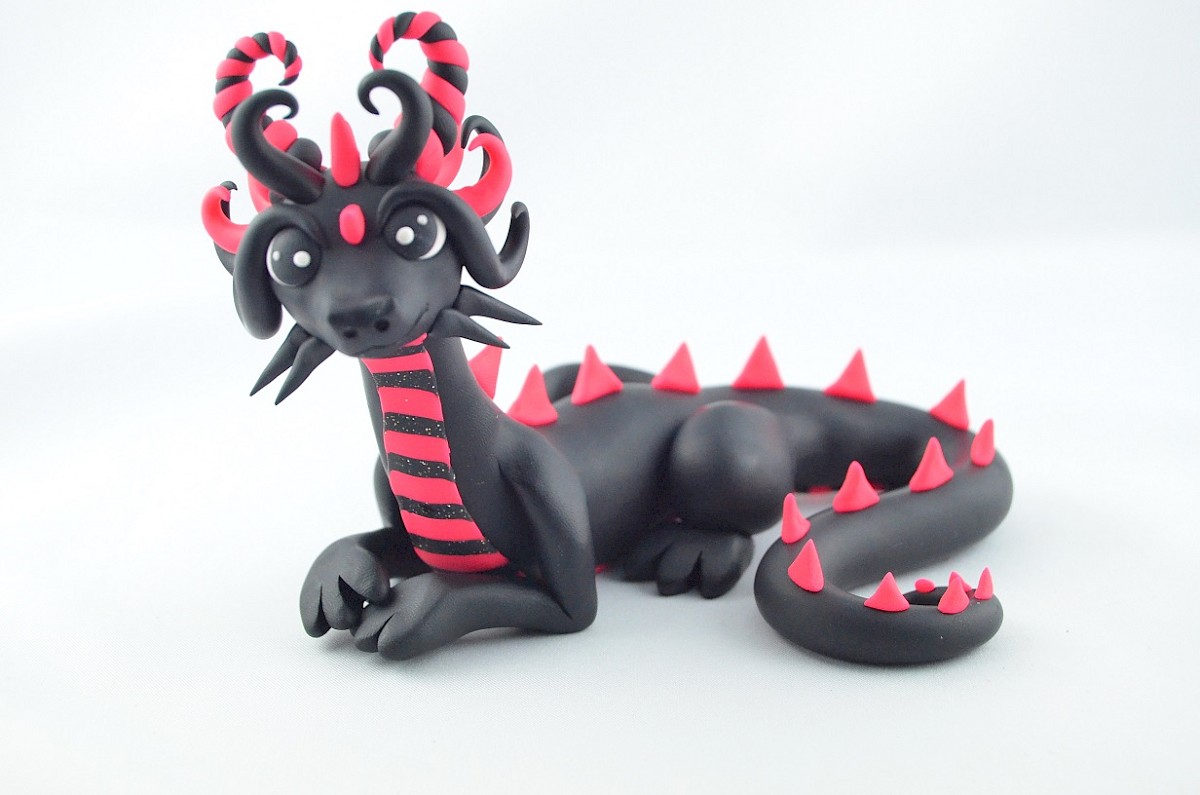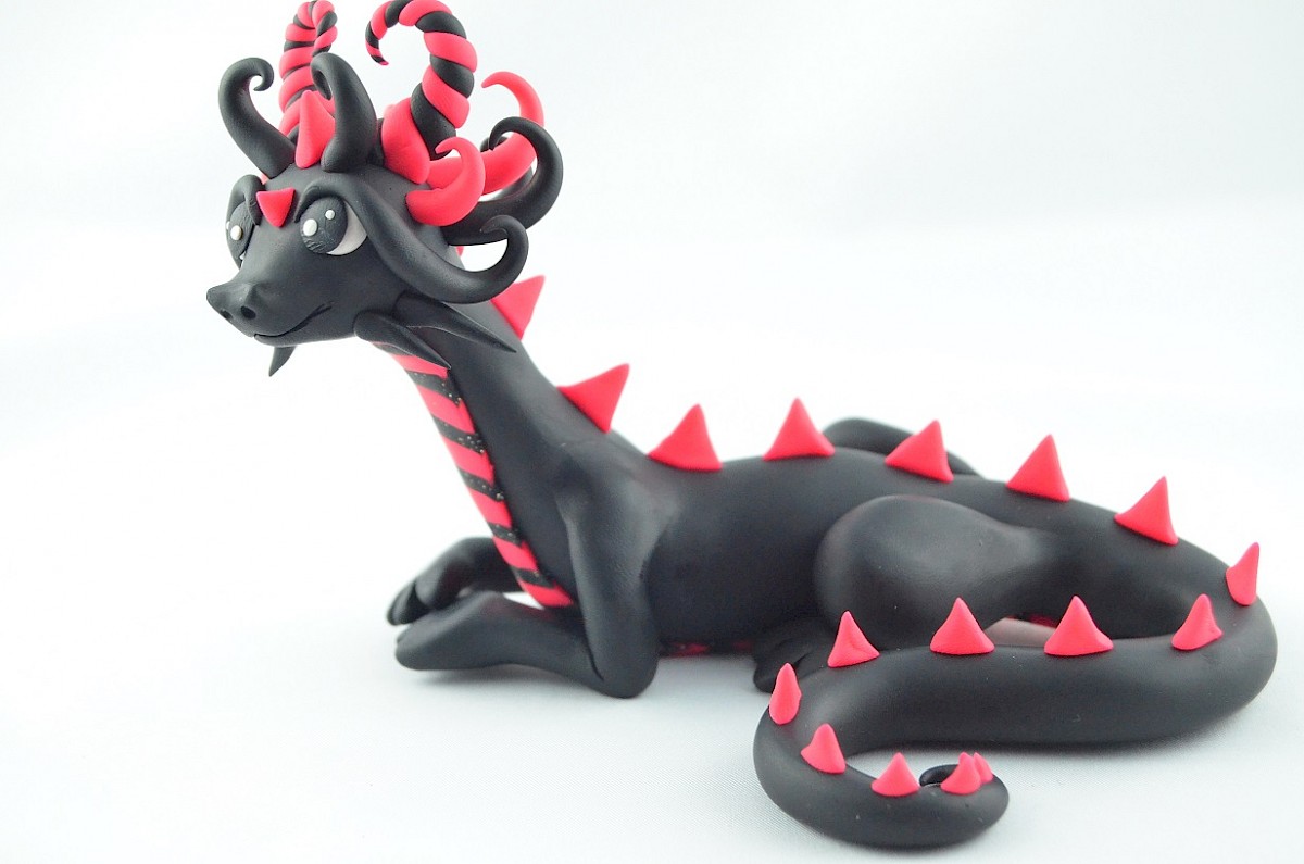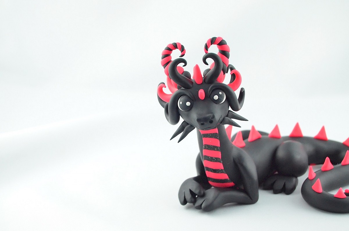 Black dragons are unique. They are rare what makes them look special. The handmade dragon's details are in pink. What is more, some parts of the clay dragon body are covered by glitter. Big horns and scales are eye-catching. Watch out, the dragon may hypnotize you!