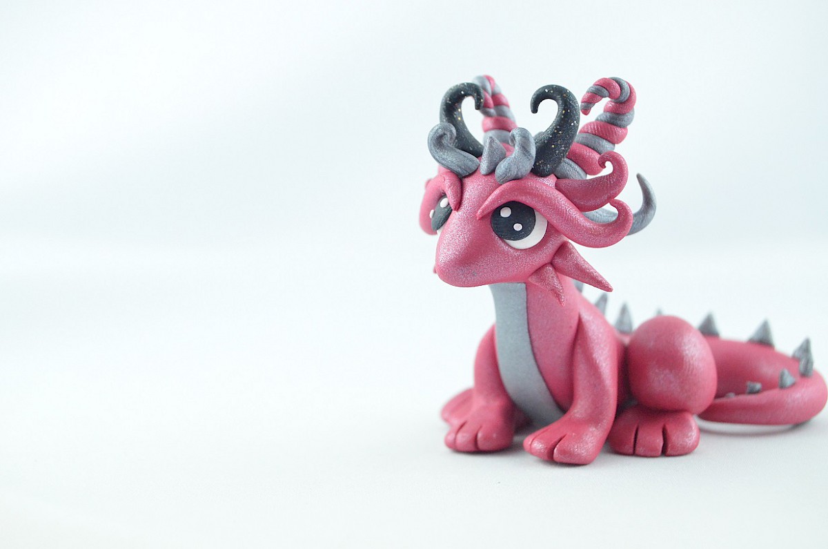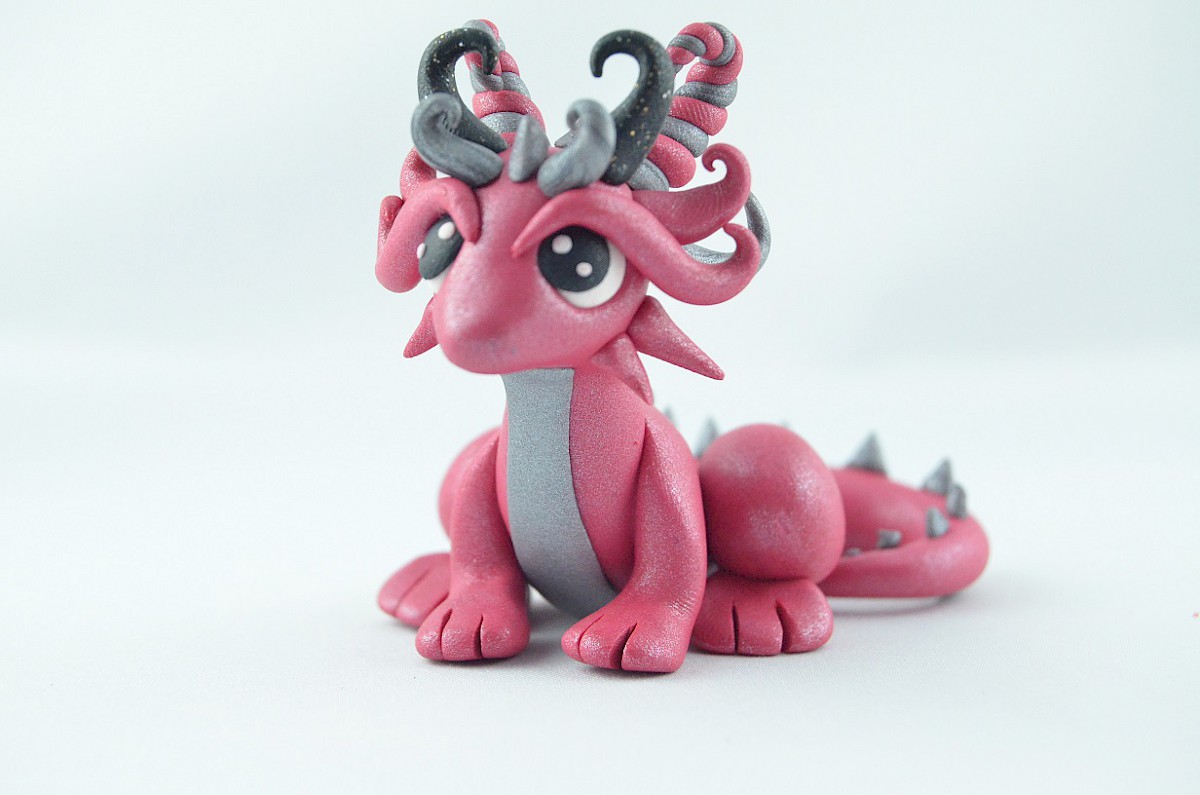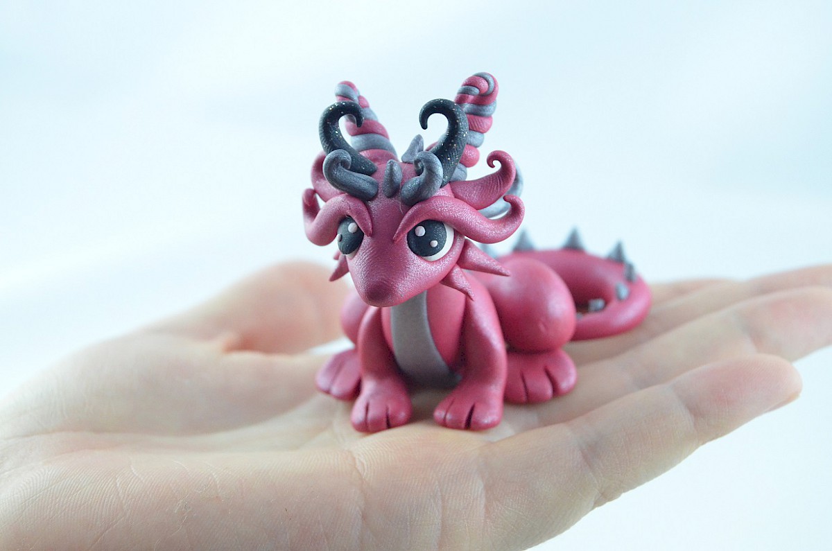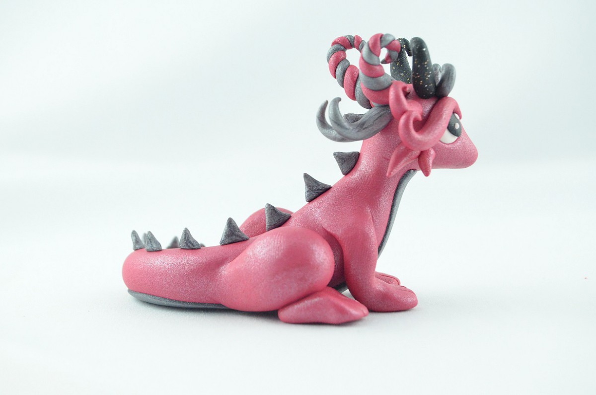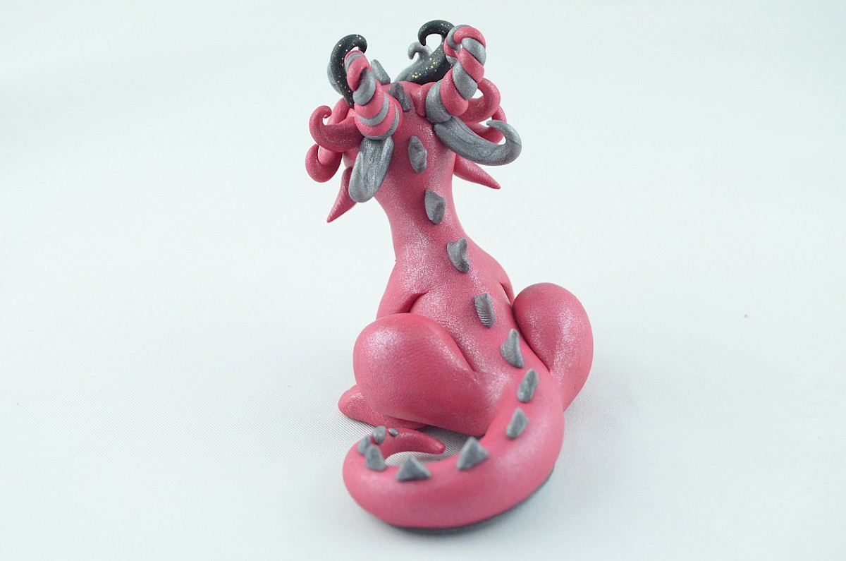 This handmade dragon is in scintillating colors pink and grey. Also, the clay sculpture has got a pair of black horns and silvery dragon scales on his tail. The dragon looks friendly and nice, he is a smart creature, too – you can notice it in his big eyes The clay dragon may be a good gift for everyone!