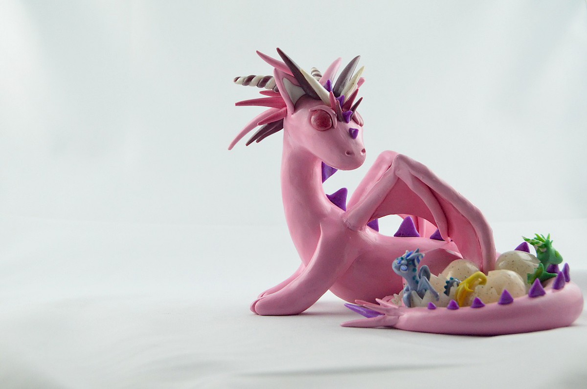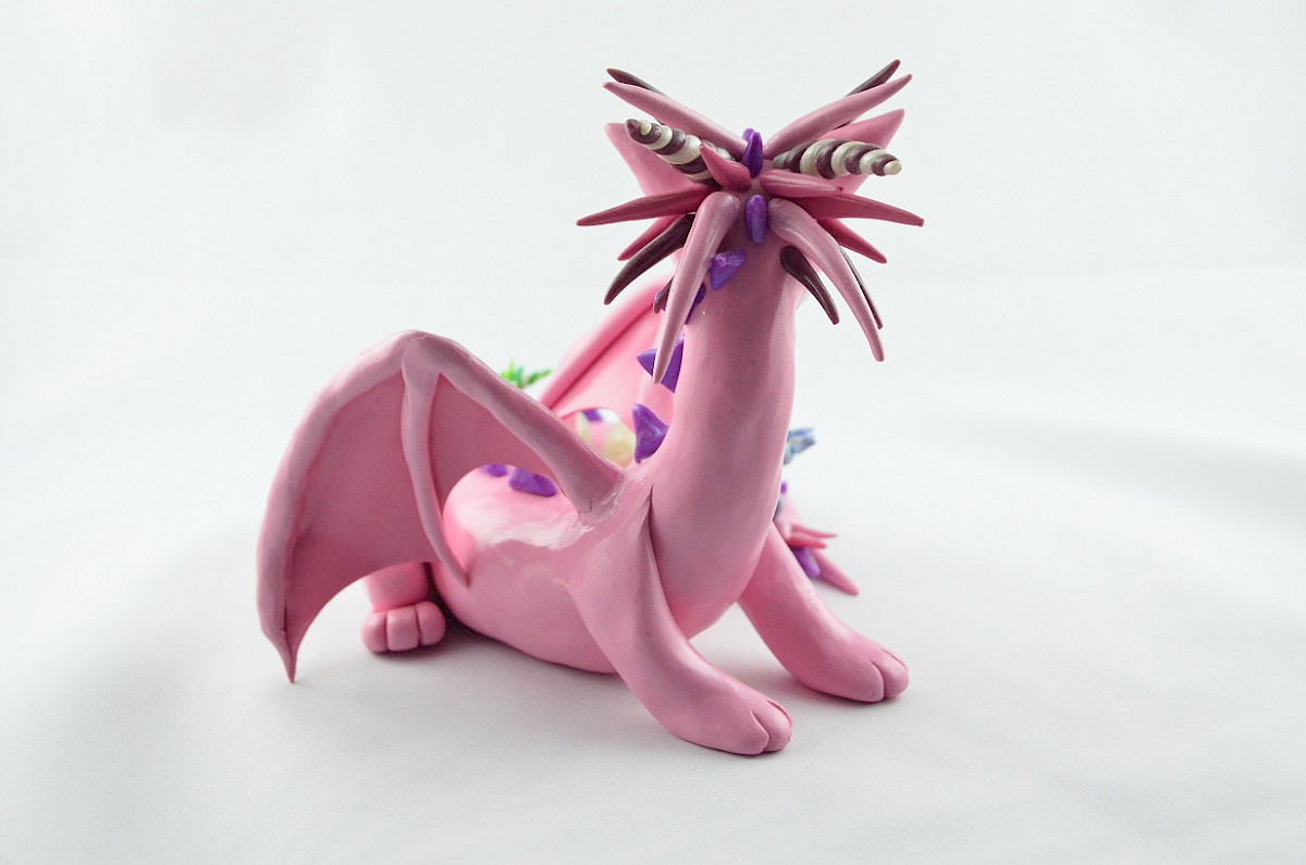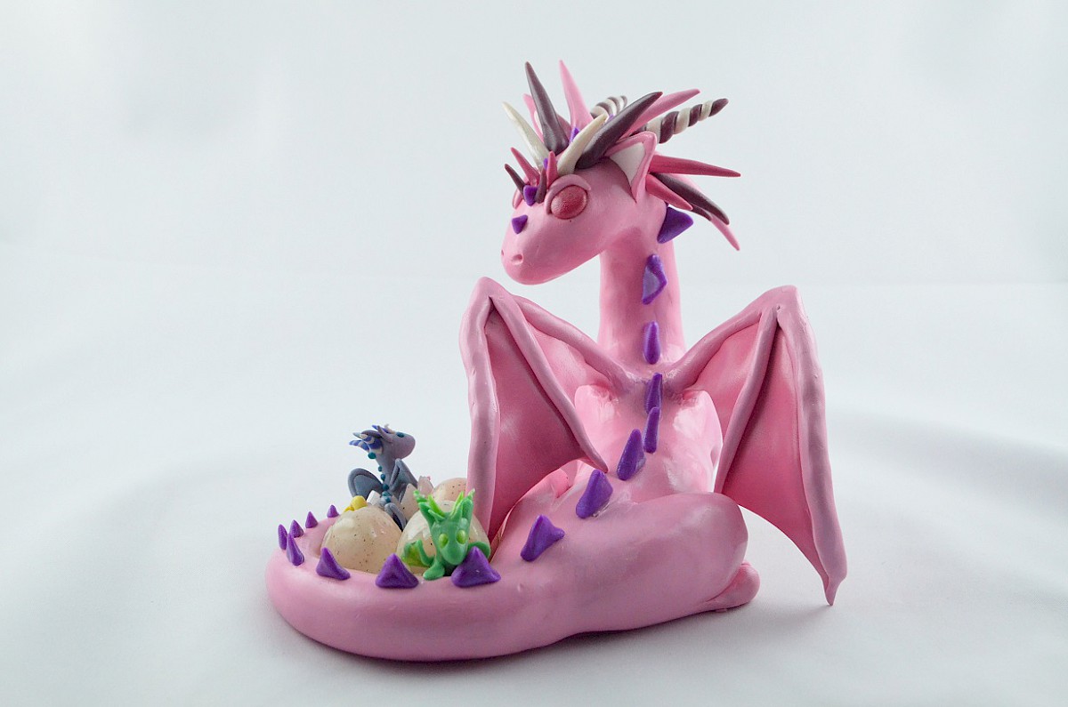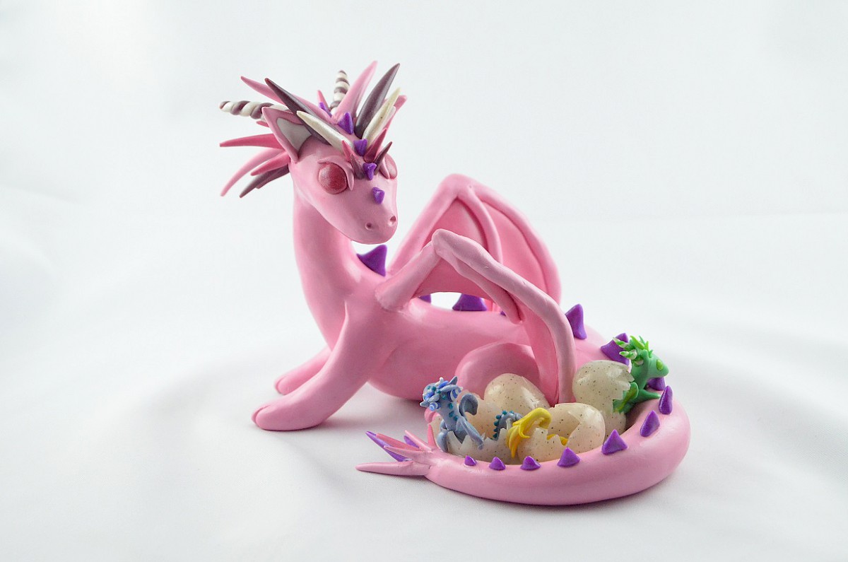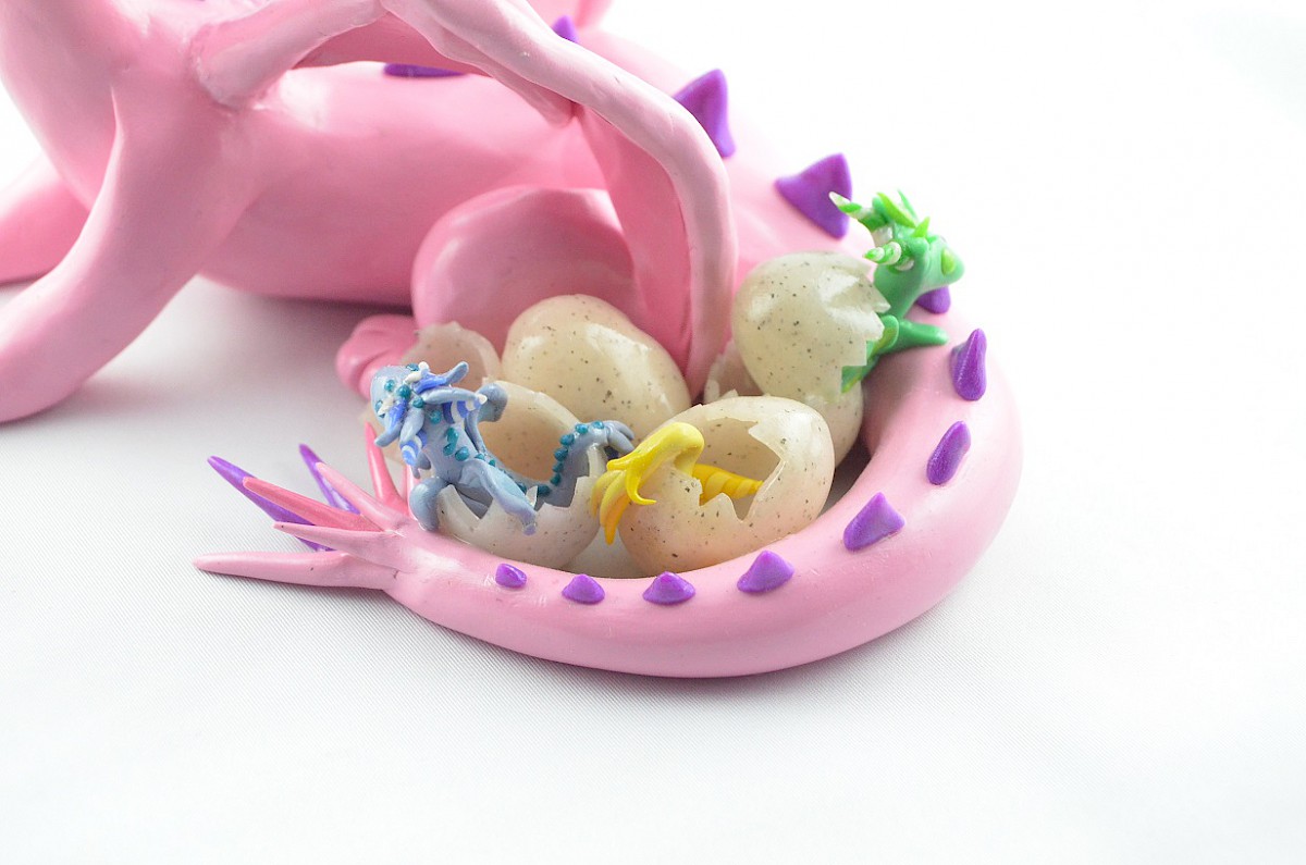 This pink handmade mama dragon is guarding her newly hatched babies. She just has made the first eye contact with her blue baby. Soon all of the clay little dragons will leave the eggs and say hello to their caring mammy. They can't wait to the lessons of flying, too!