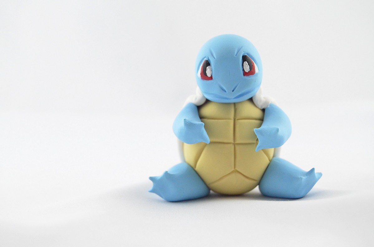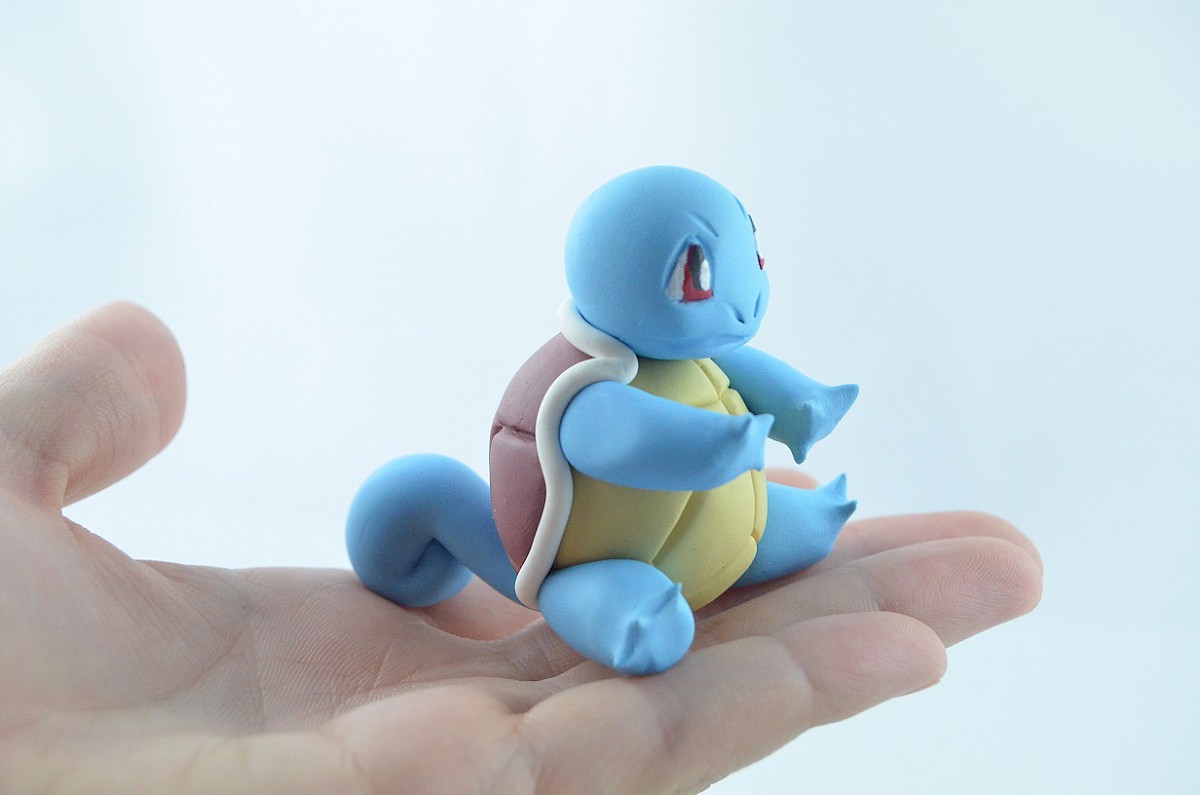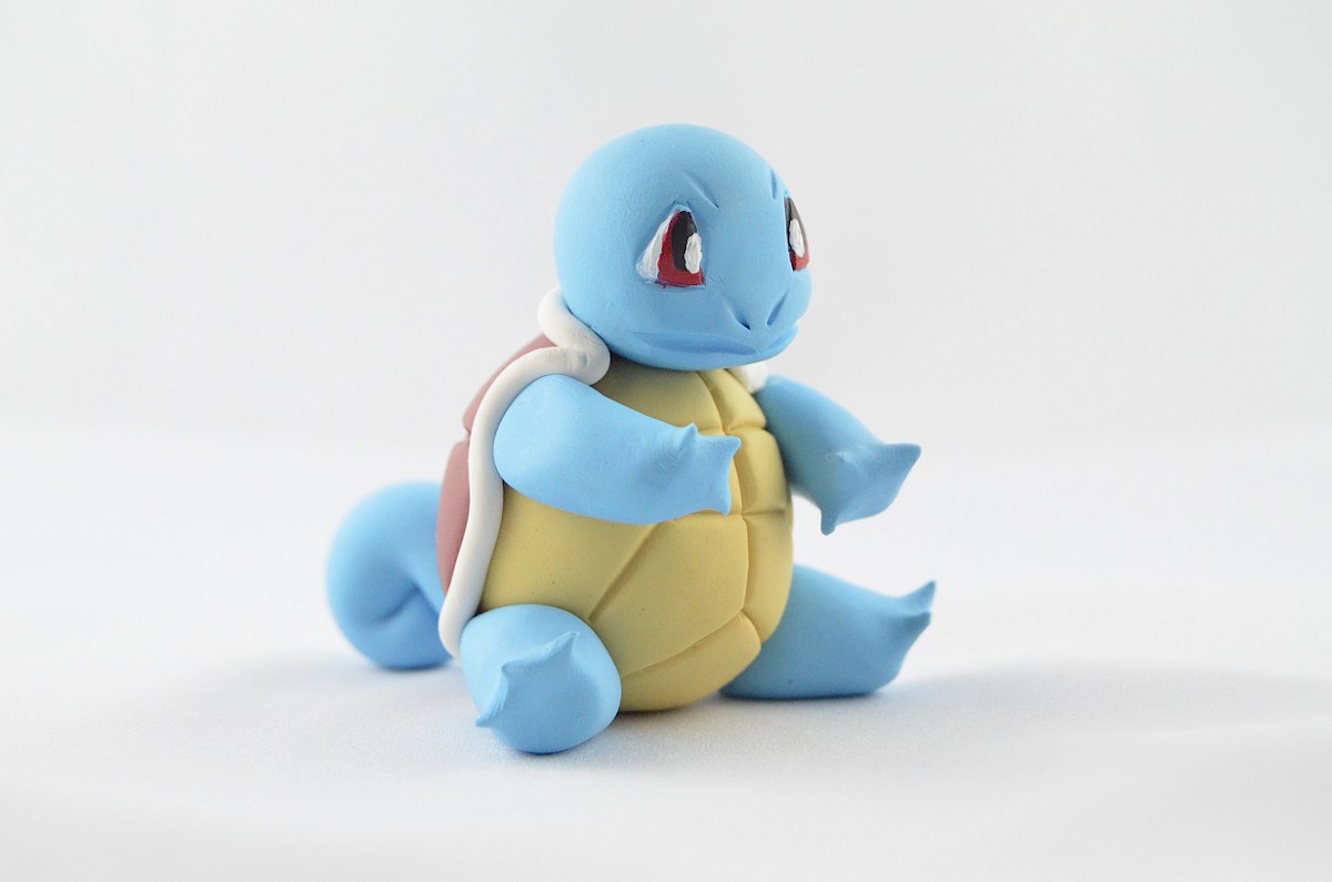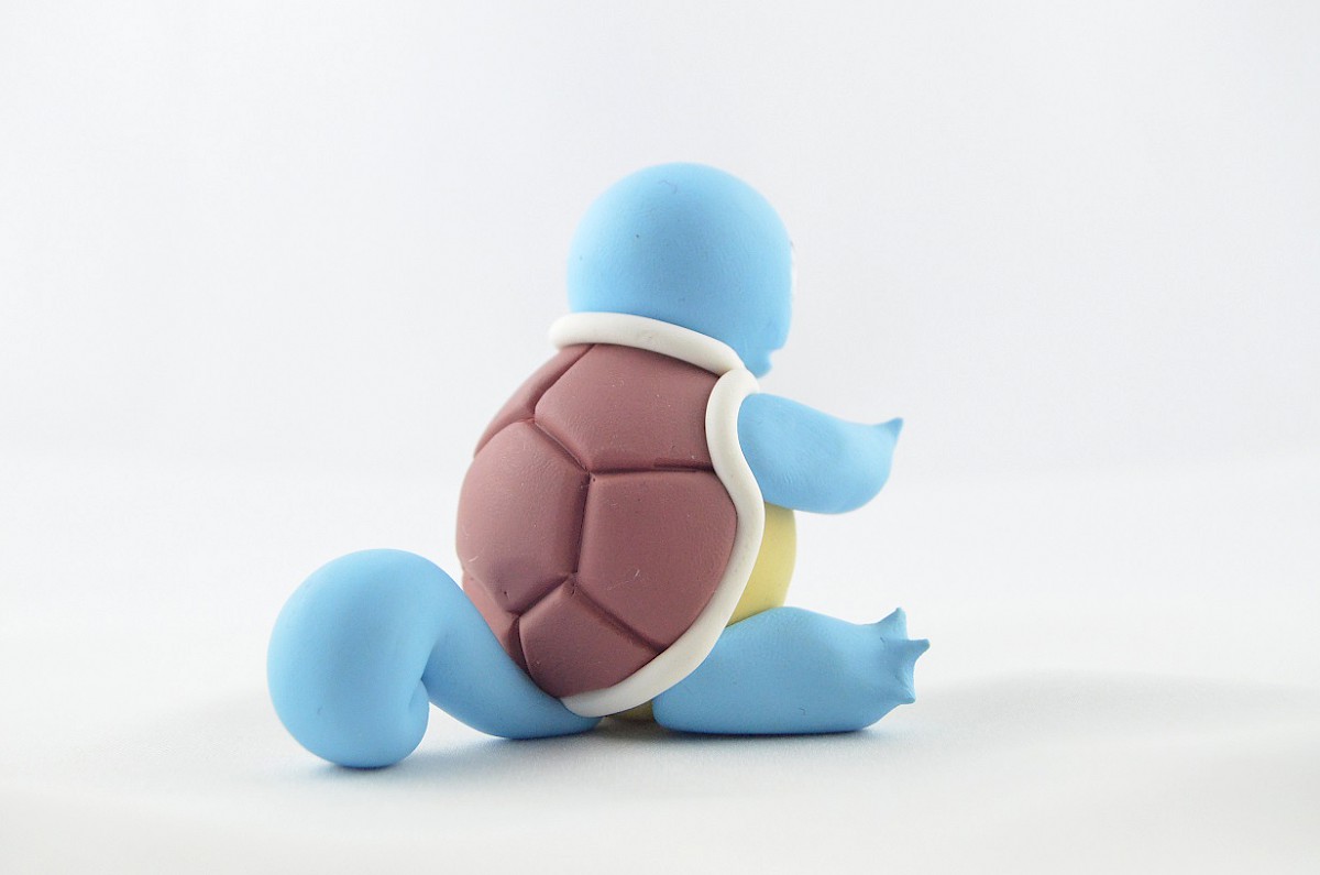 This is a handmade Pokemon, Squirtle. He looks like a turtle, the sculpture has got brown and white shell and blue curled tail.