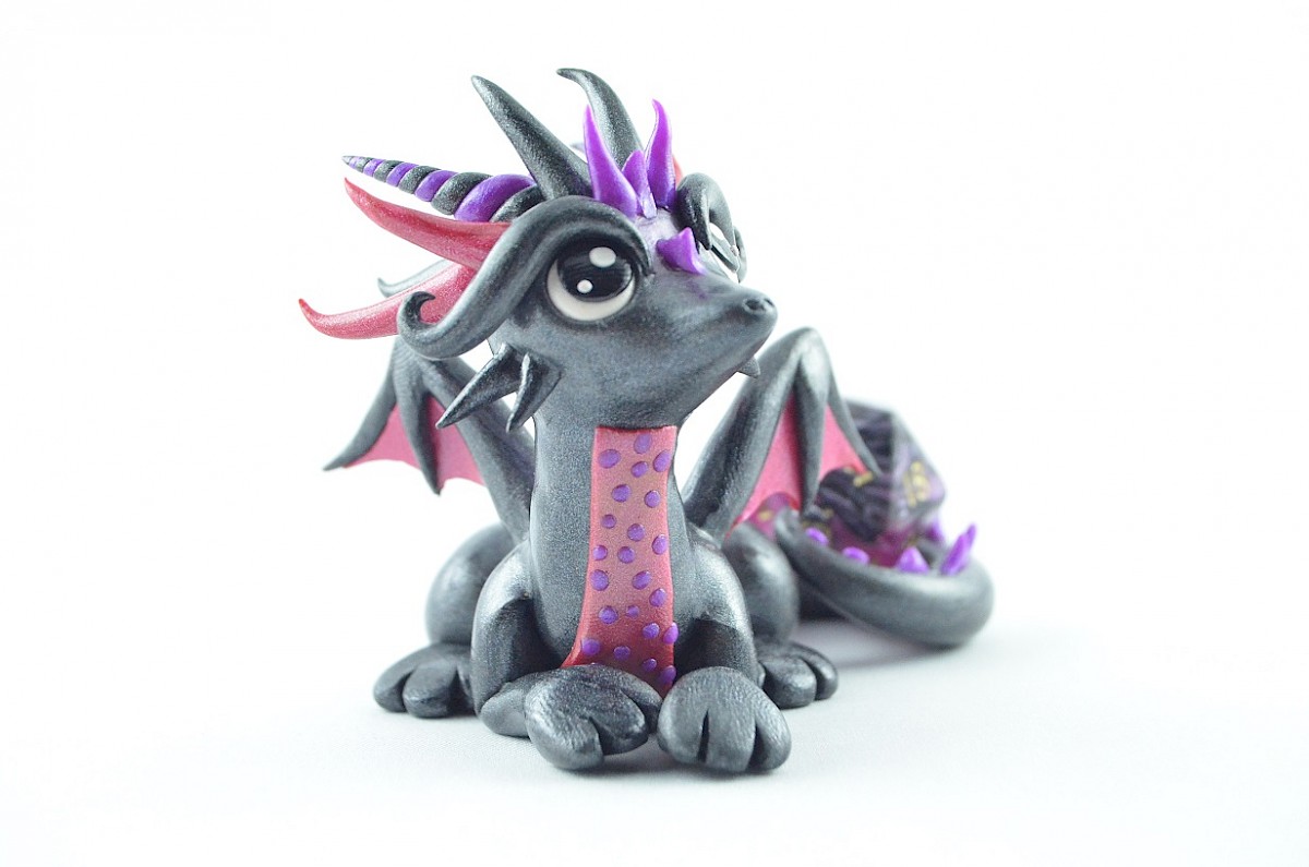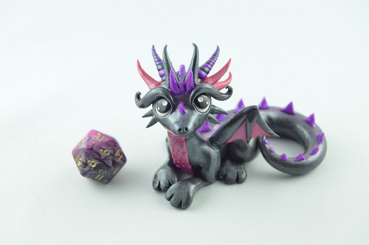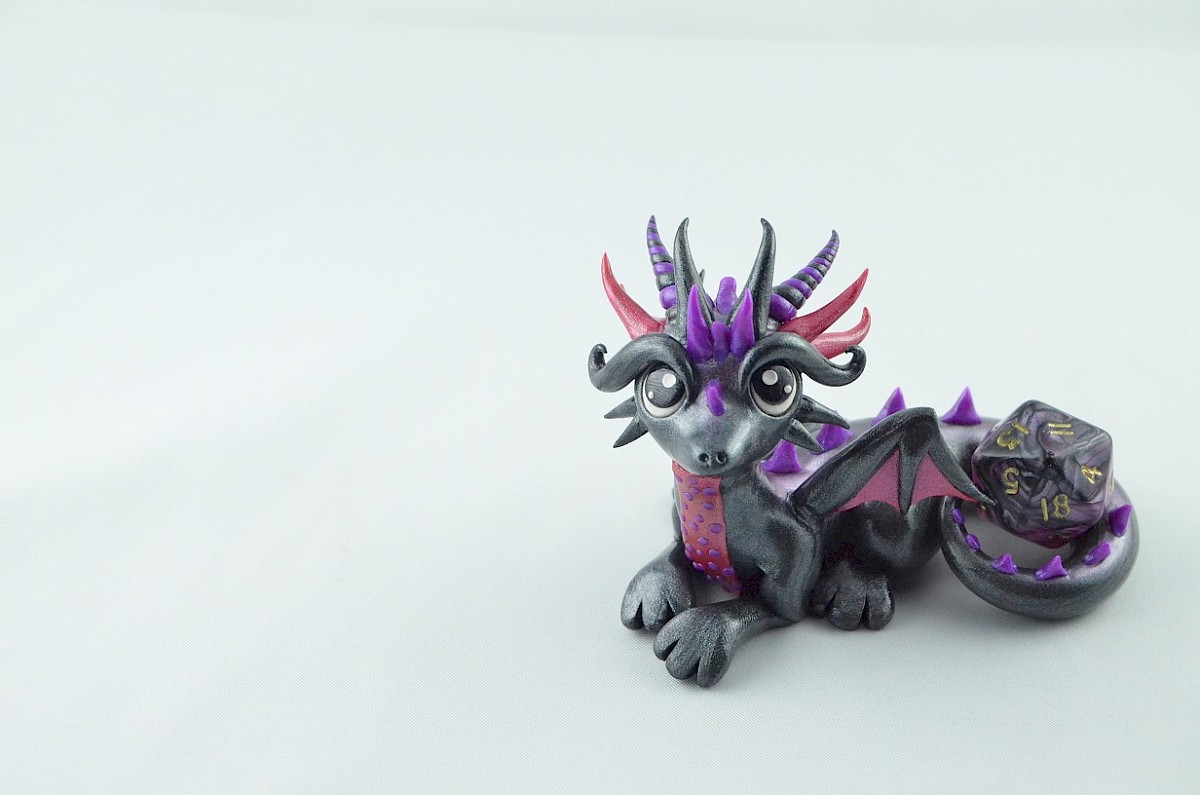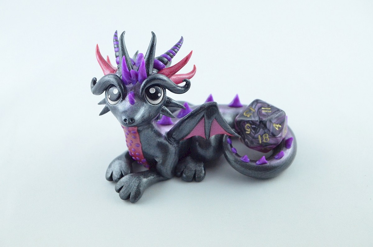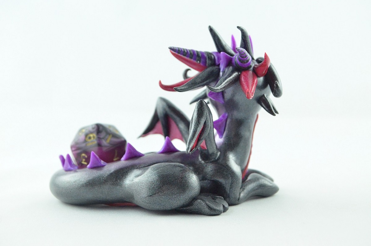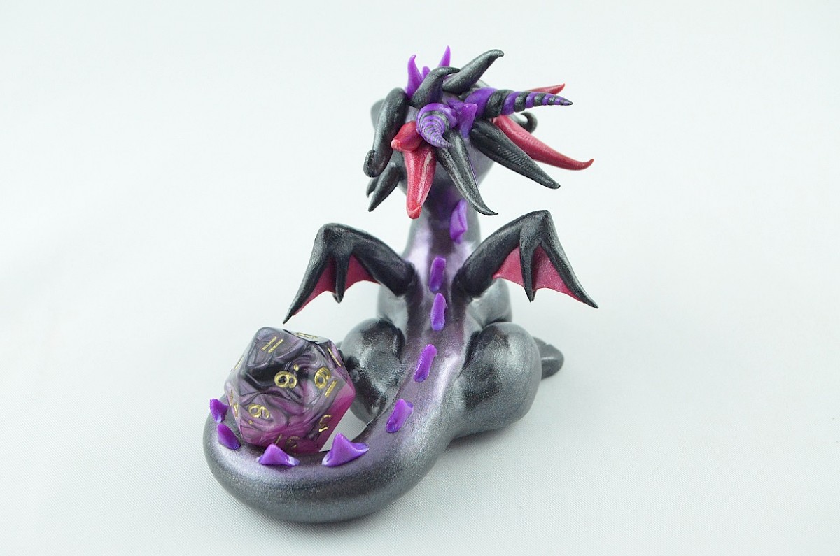on her horns, wings and dorsal ridge.. or the elegant tail curled around a purple gamers dice. Pink and Violet detailing covers her throat and disappears under her shimmering obsidian body as