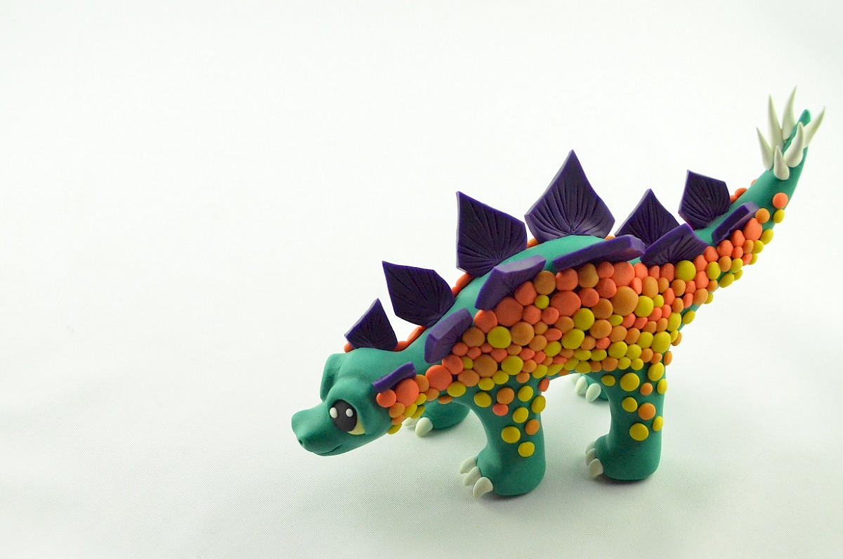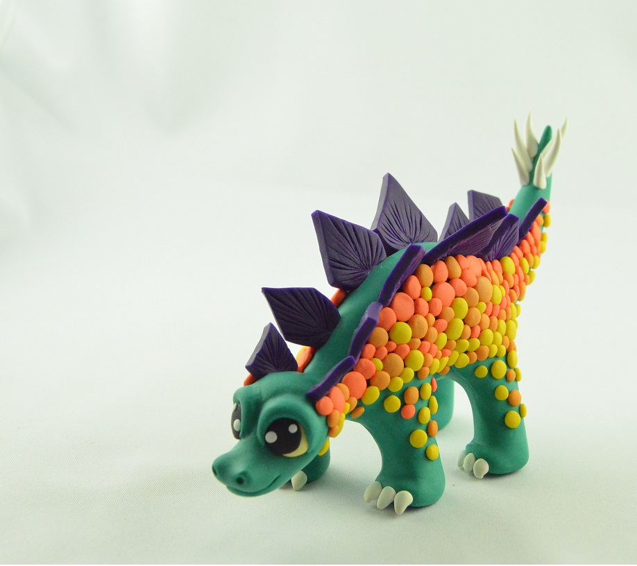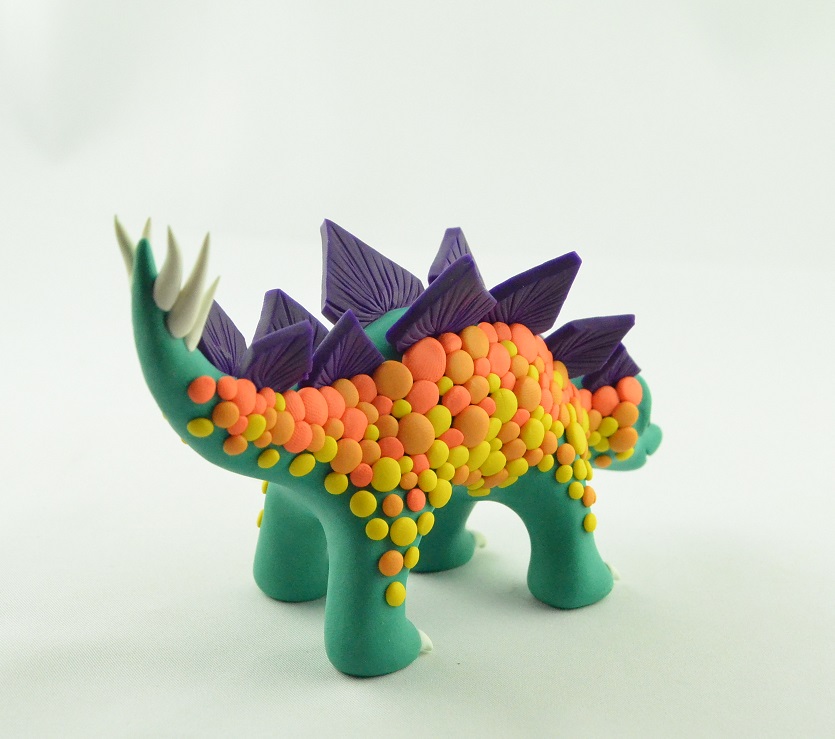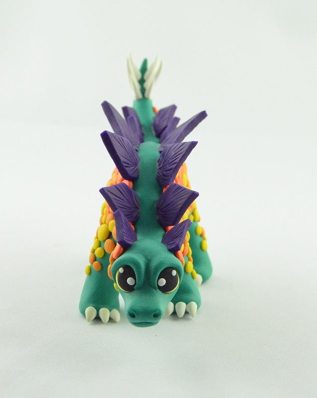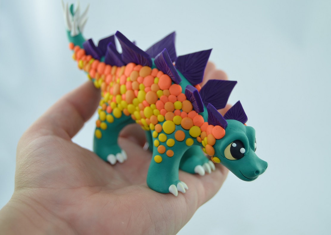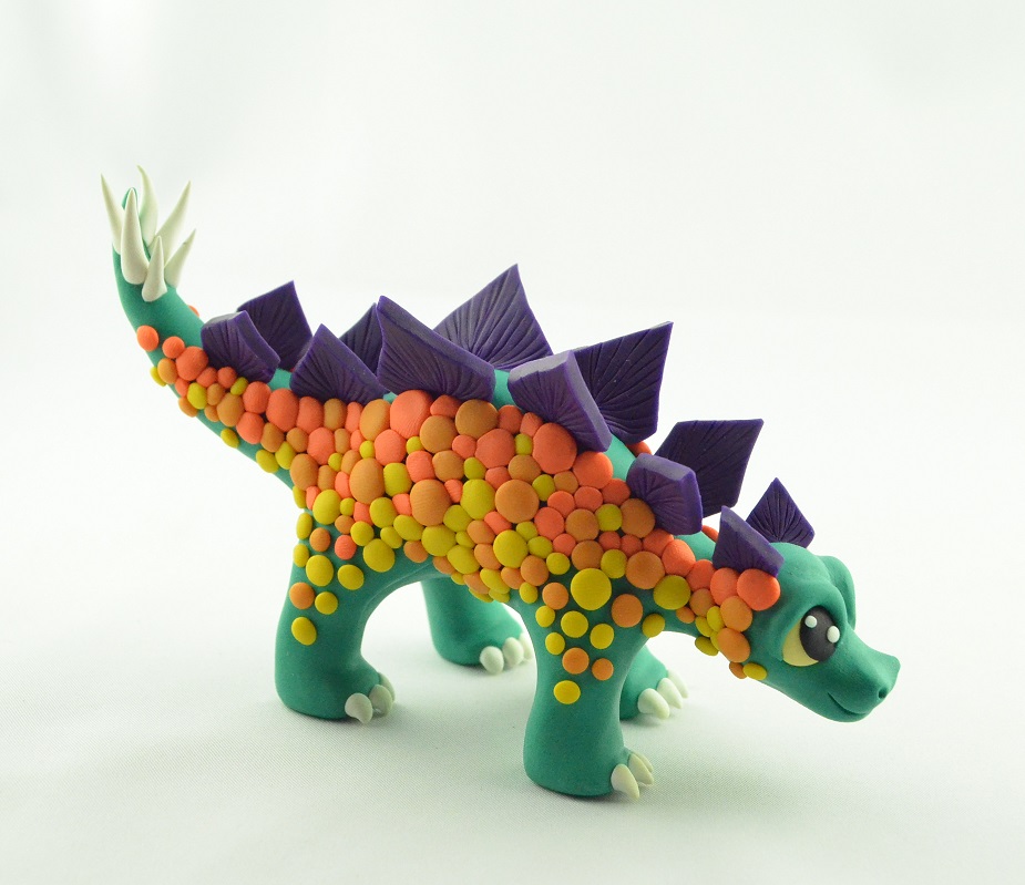 The dino's body is covered by round scales in bright colors which go with the purple bony plates decorating his back. Stegosaurus statue has a pair of big cute eyes making him look as a friendly dinosaur. Claws and spikes on the tail of the handmade figurine seem to be real.