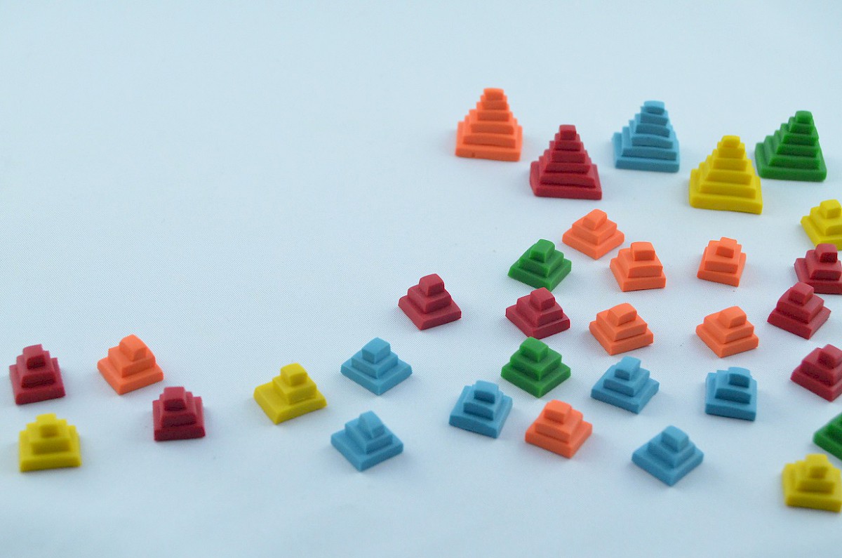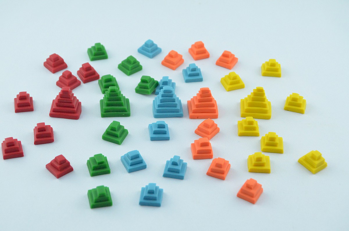 each color has 1 big marker for scoring points and 6 small markers for keeping track of progress in technologies and temples.
