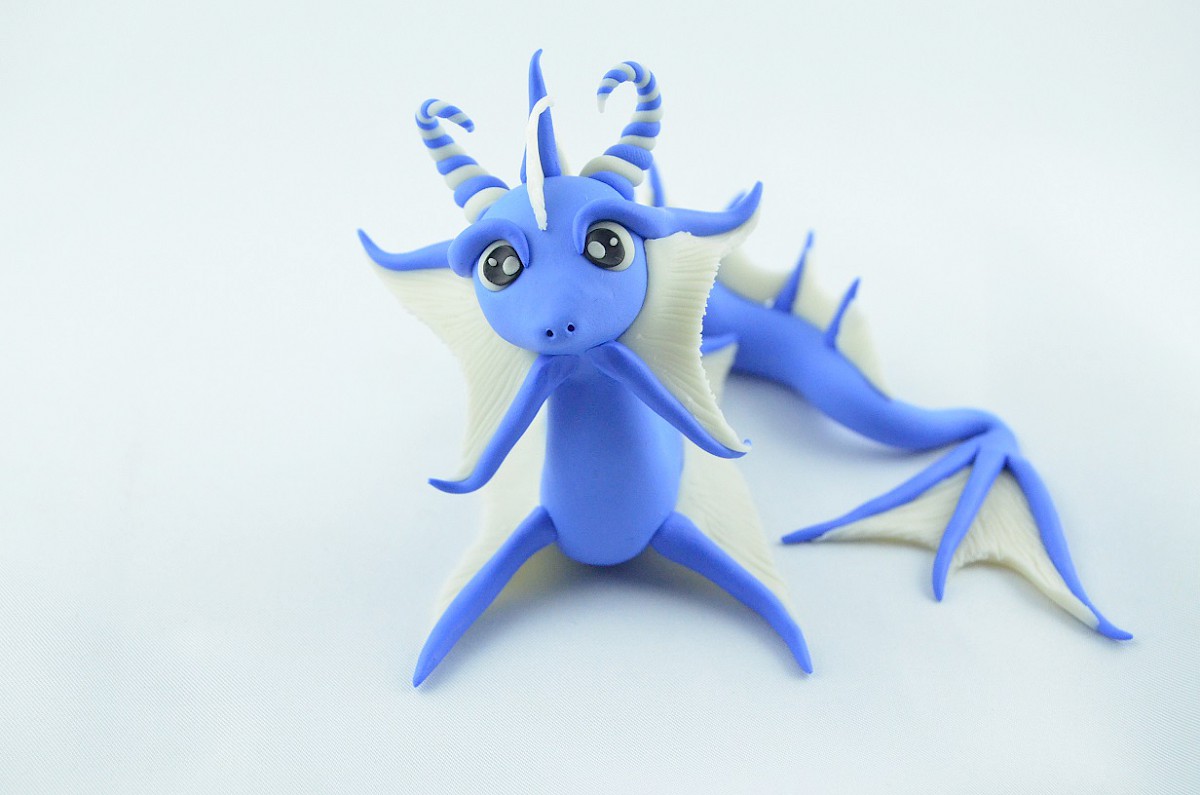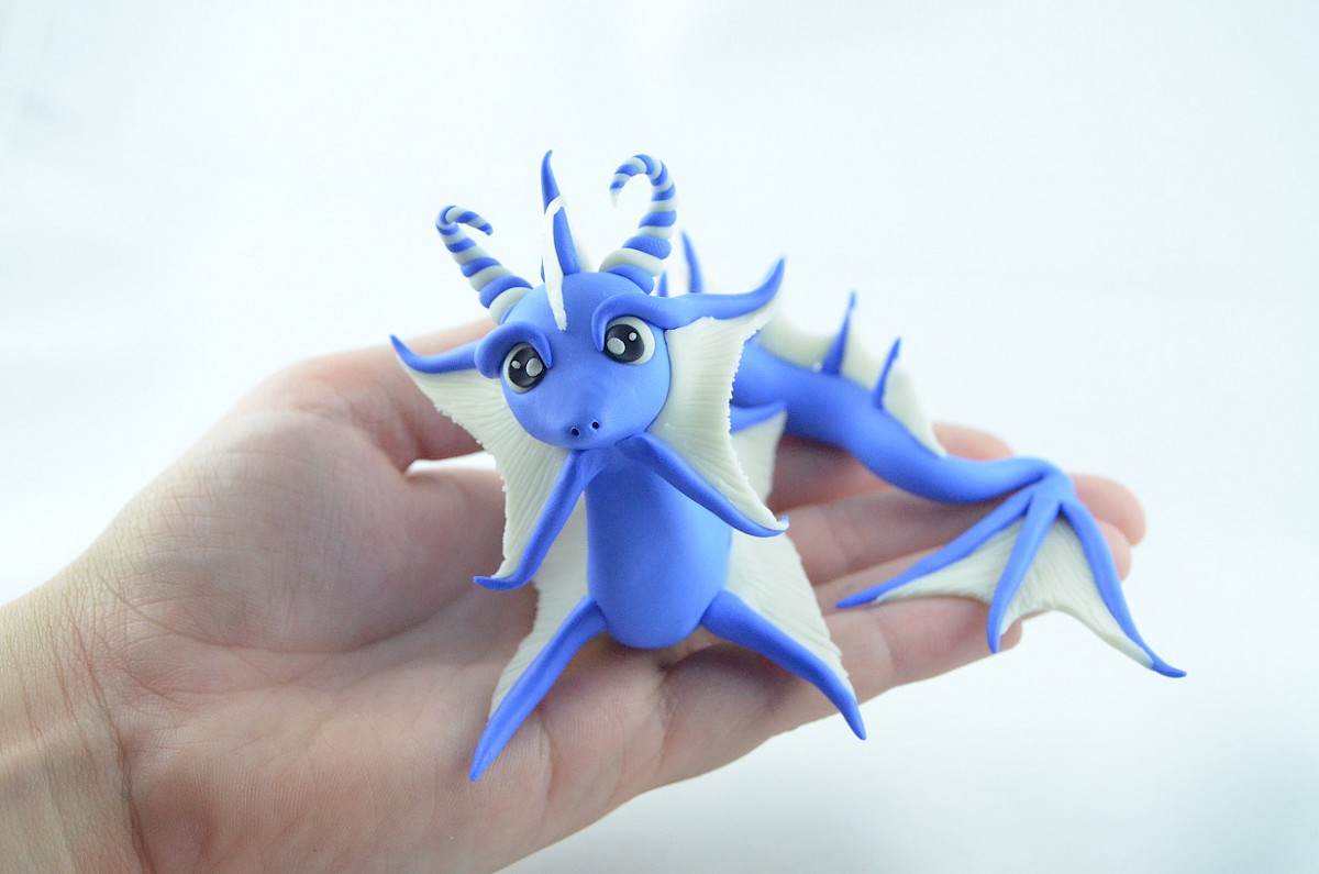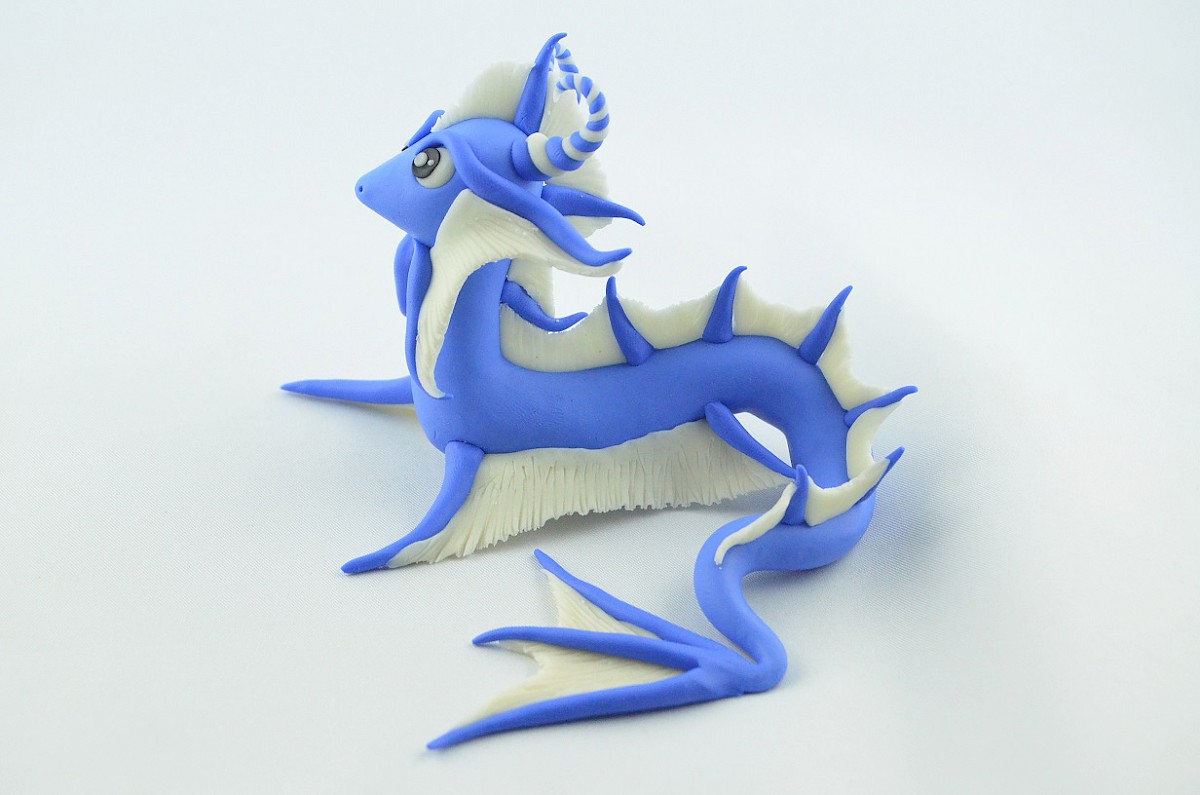 This is a blue handmade water dragon. He has got big white fins and the same color dorsal fin on his back which help the dragon swim.