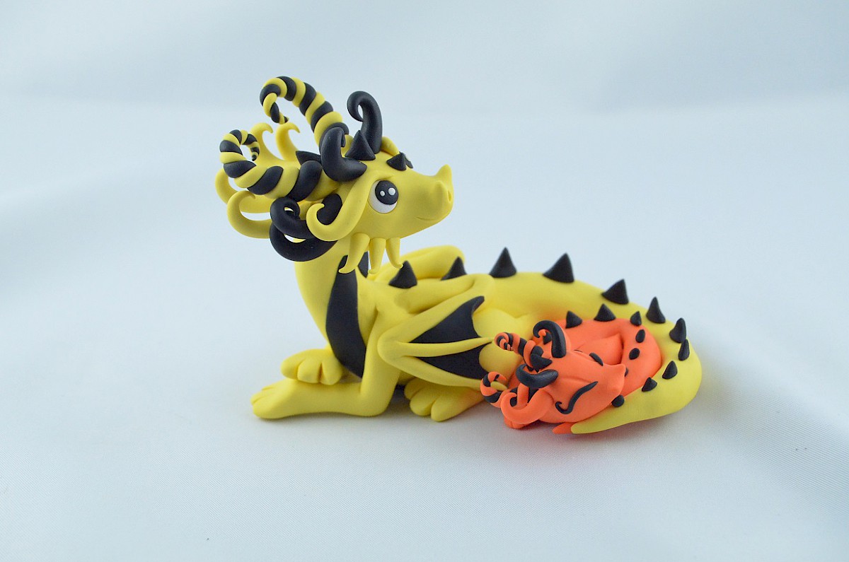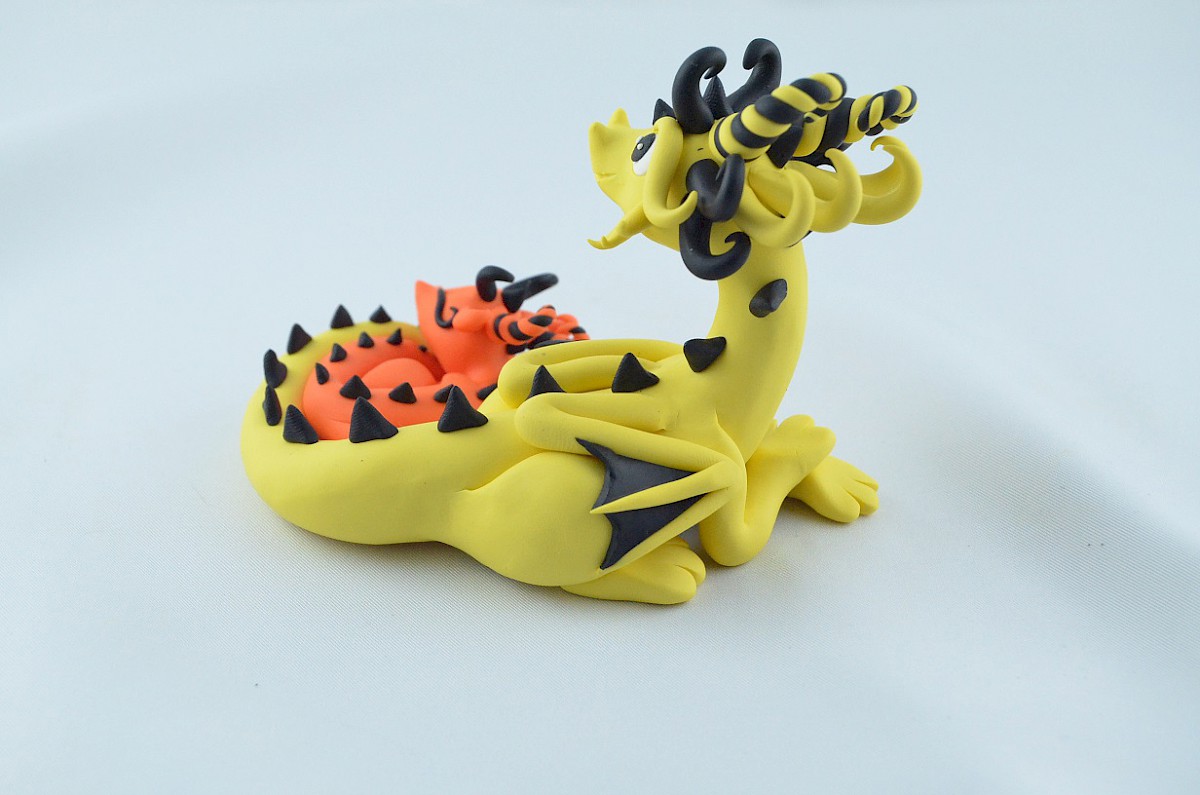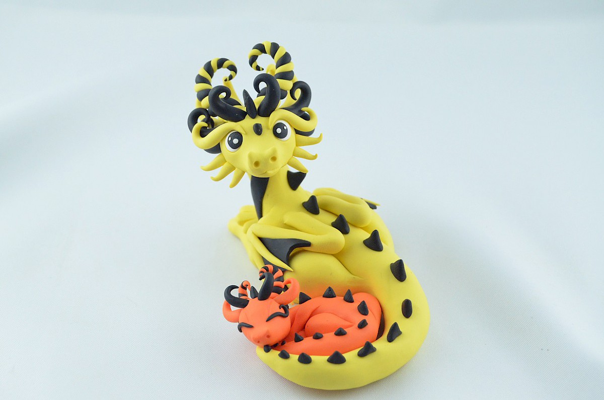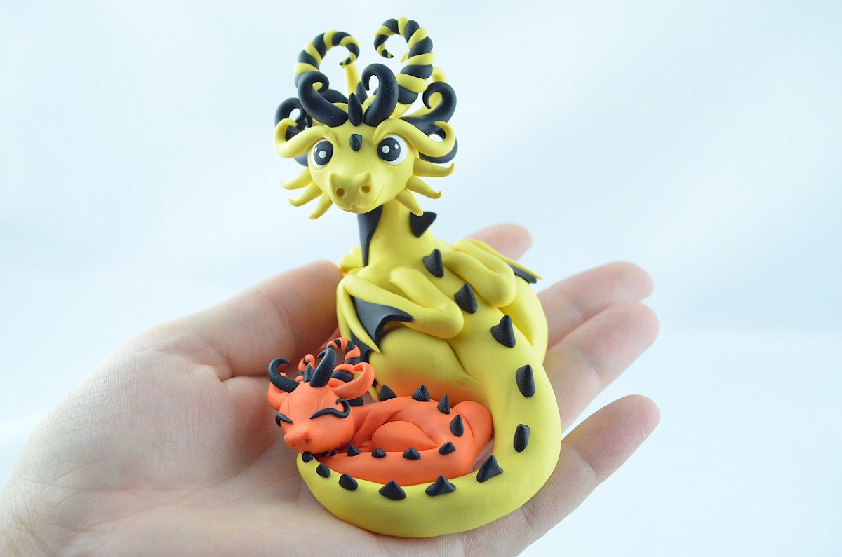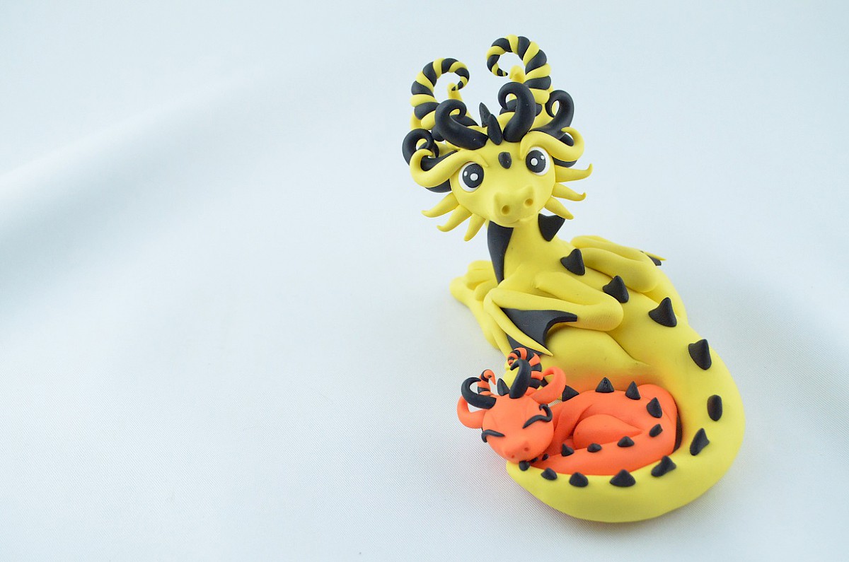 The majority of clay dragons loves having company. They are friendly creatures living in families, just like those two handmade dragons. The yellow one is the mommy of the orange dragon. The dragon mum is very caring. You can order the dragon sculpture and use it as a special gift (fully handmade and unique).